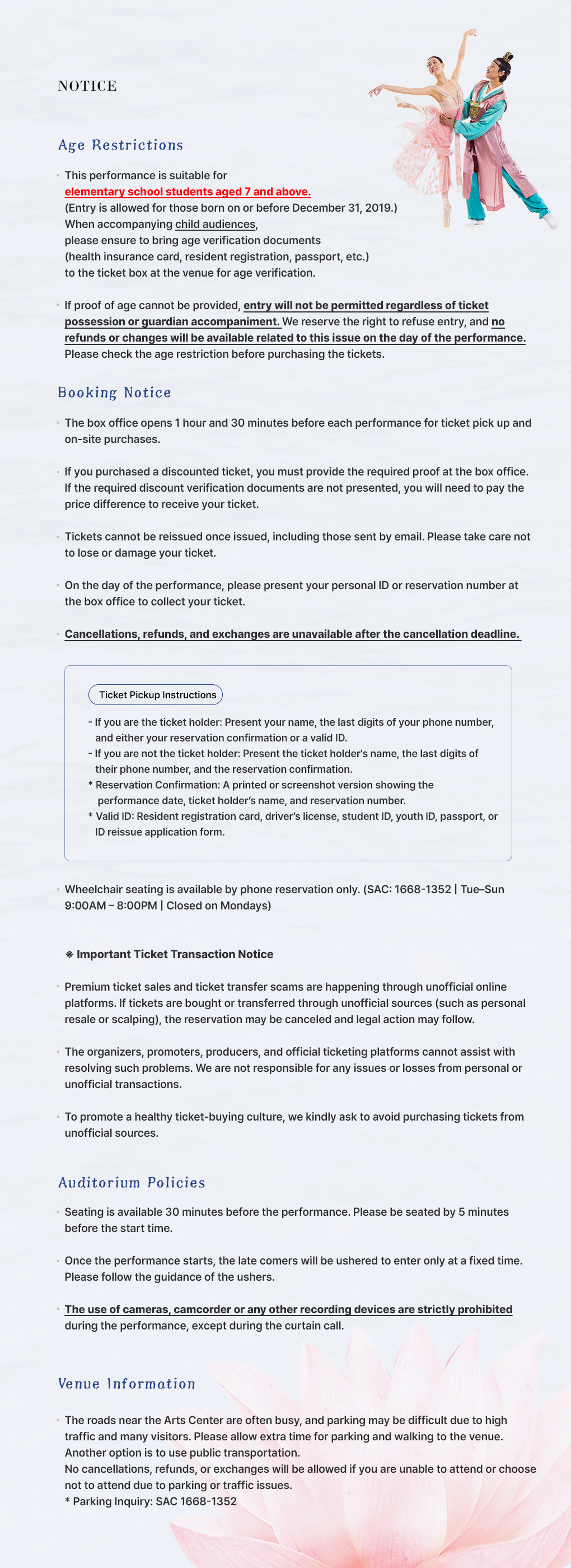 | 9 days to 1 day before the event | 10% of paid amount | In case of tickets purchased up to 3 days before the performance, there will be no cancellation fee if cancelled on the day of the purchase (call: ~20:00 / visit Service Plaza: ~20:00(Tue~Sun), ~18:00(Mon) / homepage or mobile: ~23:59) |