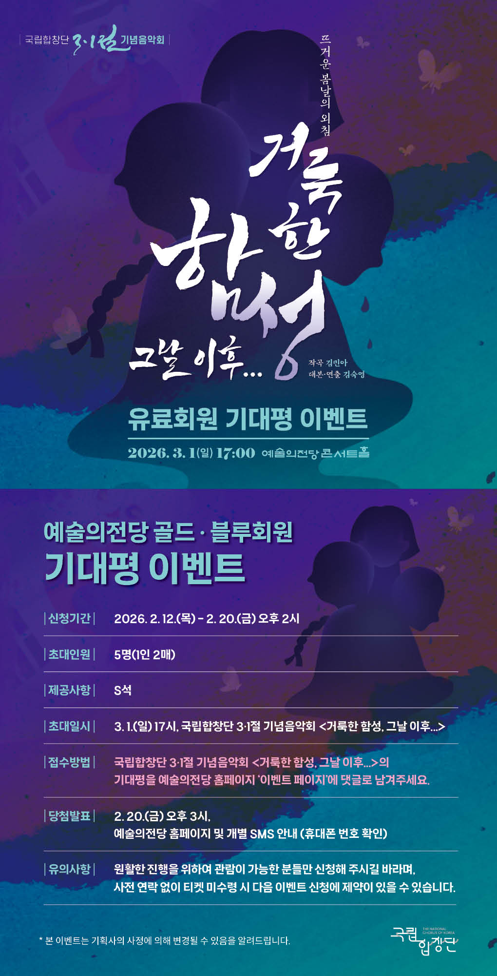 [골드·블루회원] 국립합창단 3.1절 기념음악회 <거룩한 함성, 그날 이후...> 기대평 이벤트