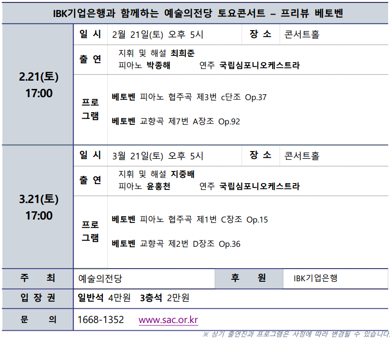 IBK기업은행의 후원으로, 예술의전당 <토요콘서트>는 문화소외계층을 초청해 클래식 음악 향유의 기회를 확대하고, 문화 나눔과 사회적 가치 실현에도 기여하고자 한다. 본 공연은 2026년 2월 21일, 3월 21일, 5월 16일, 7월 18일, 8월 15일, 10월 17일, 11월 21일, 12월 19일 총 8회에 걸쳐 진행된다. 입장권은 일반석 4만 원, 3층석 2만 원이며, 예술의전당 홈페이지(www.sac.or.kr), 콜센터(1668-1352), NOL티켓을 통해 예매할 수 있다. (끝)
