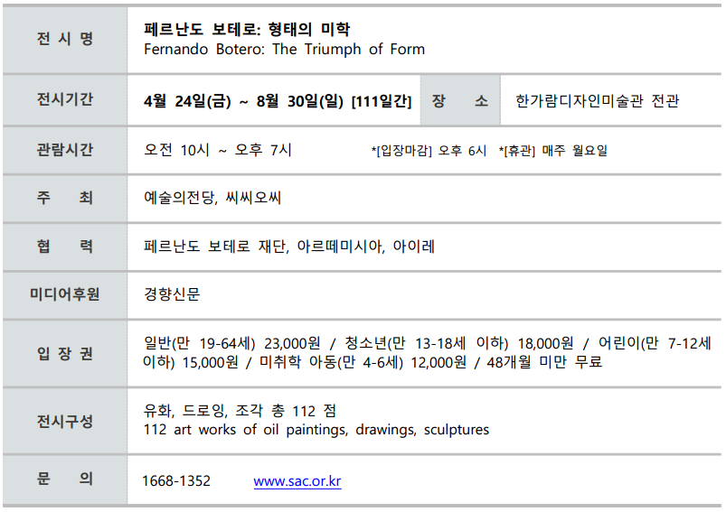 한가람디자인미술관에서 《페르난도 보테로: 형태의 미학》을 개최한다. 본 전시에는 창간 80주년을 맞은 경향신문이 독자와 함께 쌓아온 신뢰의 시간을 되새기고, 그 의미를 문화적 공감으로 확장하고자 본 전시에 미디어 후원으로 함께한다.