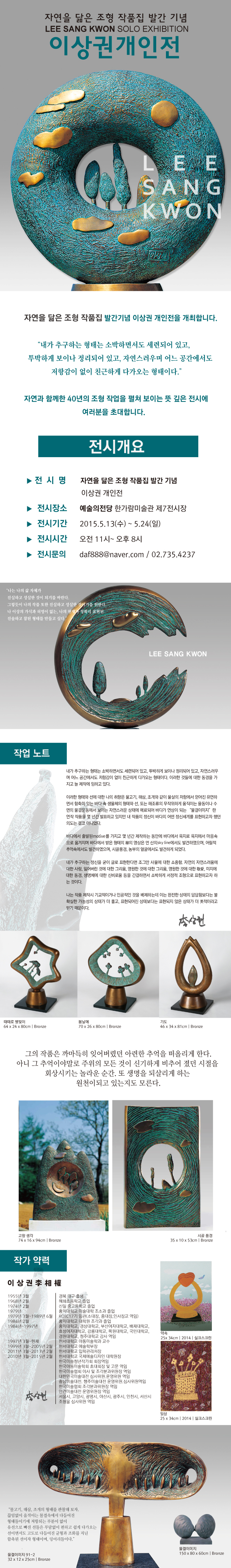 자연을 닮은 조형 작품집 발간 기념 <이상권 개인전>이 2015년 5월 13일 예술의전당 한가람미술관 제7전시실에서 개최된다. 30여 년 동안 오로지 조각과 함께 한 작가 이상권의 이번 전시는 그의 대표 작품 70여 점과 함께 특별한 판화 작품을 한 자리에서 만나볼 수 있는 좋은 기회가 될 것이다. 또한 “자연을 닮은 조형” 작품집을 통해 조각가 이상권의 초기와 중기 그리고 현재에 이르는 작품세계를 조망해 보고 한국 현대 조각의 큰 흐름을 만나볼 수 있을 것이다.