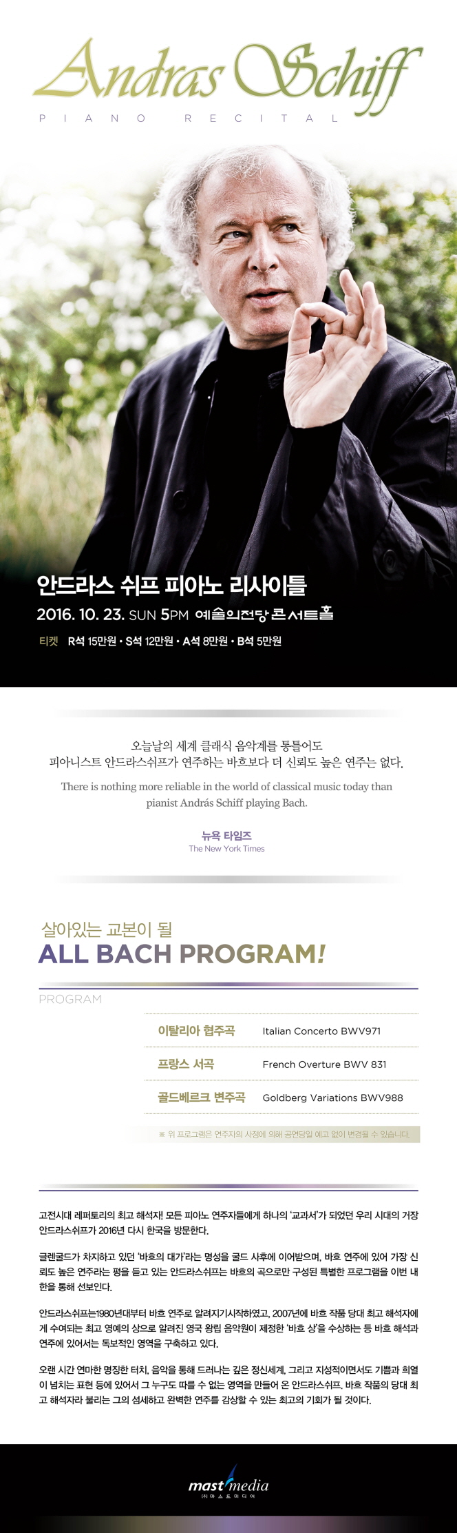 오랜 시간 연마한 명징한 터치, 음악을 통해 드러나는 깊은 정신세계, 그리고 지성적이면서도 기쁨과 희열이 넘치는 표현 등에 있어서 그 누구도 따를 수 없는 영역을 만들어 온 안드라스 쉬프. 바흐 작품의 당대 최고 해석자라 불리는 그의 섬세하고 완벽한 연주를 감상할 수 있는 최고의 기회가 될 것이다.