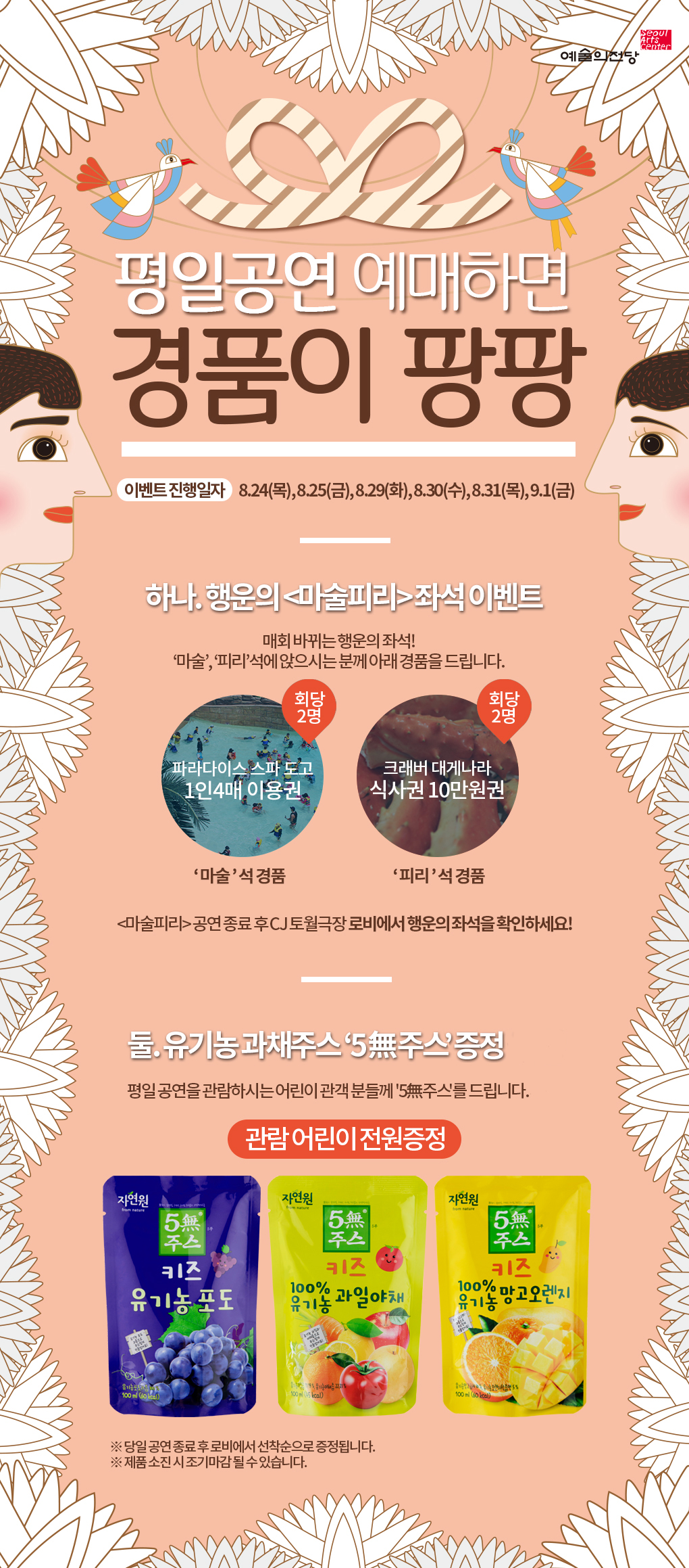 * 아래 입력된 할인 권종은 평일(화요일~금요일) 또는 주말(토요일~일요일) 공연에 한하여 적용되는 할인 권종입니다. 예매 시 참고 부탁드립니다.