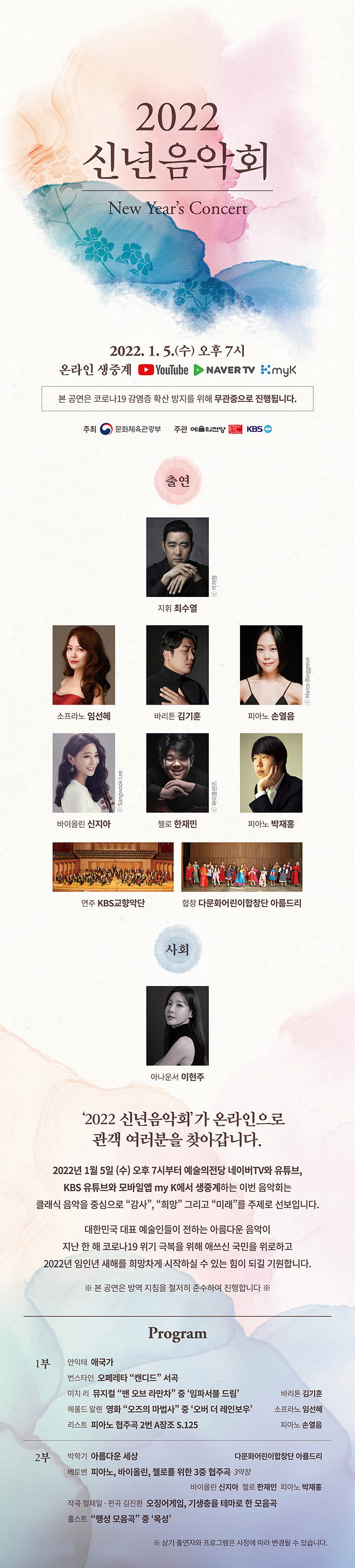 2022년 1월 5일 (수) 오후 7시부터 예술의전당 네이버TV와 유튜브, KBS 유튜브와 모바일앱 my K에서 생중계하는 이번 음악회는 클래식 음악을 중심으로 "감사", "희망" 그리고 "미래"를 주제로 선보입니다.