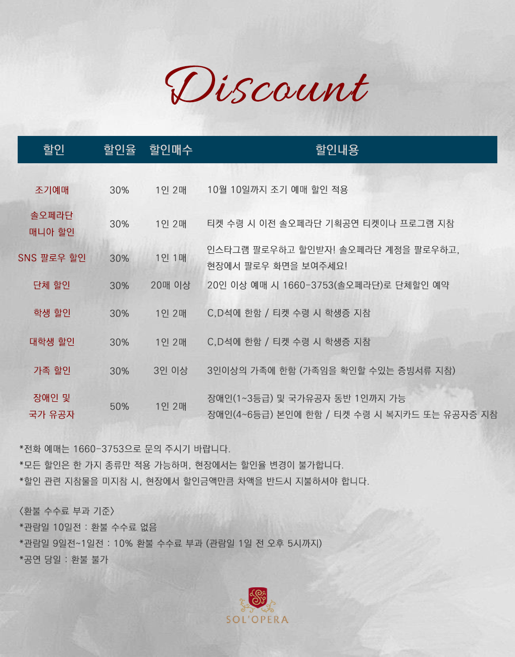 - 솔오페라단 매니아할인 30% 2매 (매수:1인2매 / 증빙서류: 이전 솔오페라단 기획공연 티켓 또는 팜플렛 지참)