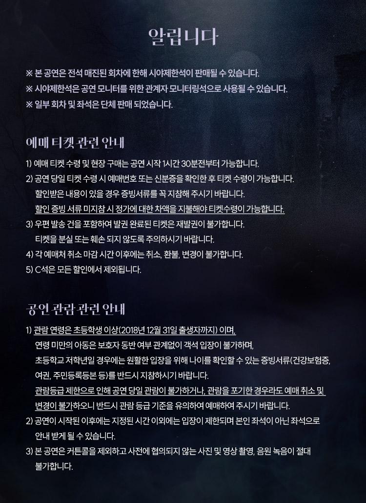 * 공연 안내와 할인 정보 미숙지로 인한 현장에서의 예매 티켓 취소 및 할인율/좌석 변경, 환불은 불가합니다.