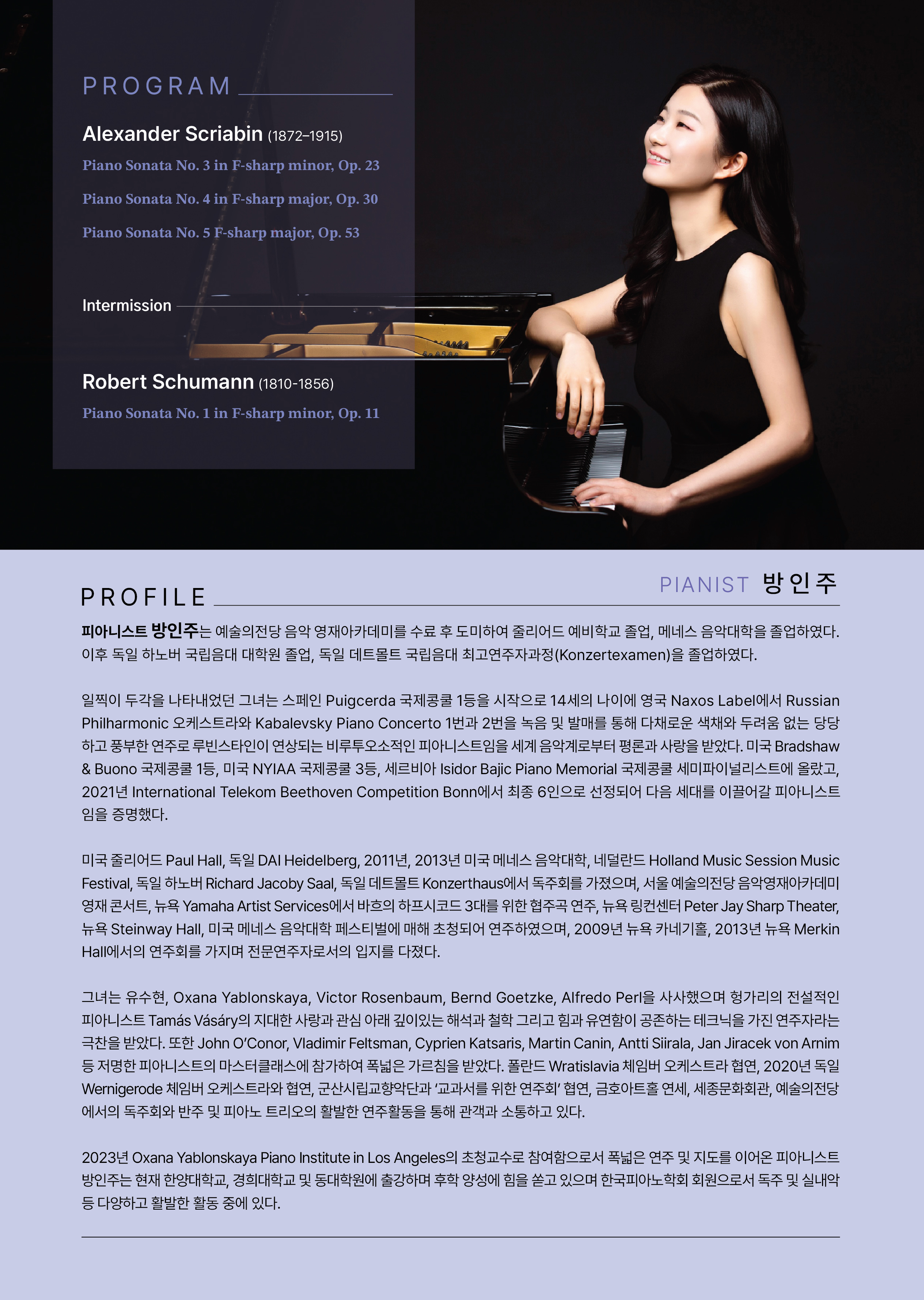2023년 Oxana Yablonskaya Piano Institute in Los Angeles의 초청교수로 참여함으로서 폭넓은 연주 및 지도를 이어온 피아니스트 방인주는 현재 경희대학교 및 동대학원에 출강하며 후학 양성에 힘을 쏟고 있으며 한국피아노학회 회원으로서 독주 및 실내악 등 다양하고 활발한 활동 중에 있다.
