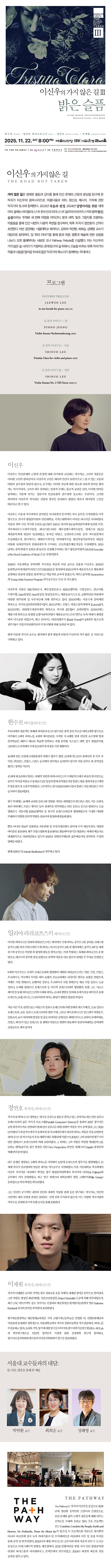 이신우의 가지 않은 길은 정제된 울림과 깊이를 통해 인간 존재의 근원과 본성을 탐구해 온 작곡가 이신우의 음악시리즈로, 아름다움과 의미, 정신성, 메시지, 가치에 관한 작곡가의 토크와 함께한다. 2023년 죽음과 헌정, 2024년 달항아리를 위한 시에 이어, 올해는 바이올리니스트 한수진과 피아니스트 일리야 라쉬코프스키와 함께 밝은 슬픔이라는 주제로 세 번째 여정을 이어간다. 밤과 새벽, 빛과 그림자를 조명하는 작품들을 통해 인간 내면의 다층적 측면을 탐구하며, 위촉 작곡가 정연호의 신작이 초연된다. 이번 공연에는 서울대학교 베리타스 강좌의 세 교수가 대담자로 참여하여, '길 위의 이야기’를 통해 몸과 마음, 영혼과 예술에 관한 성찰을 나눈다. 또한 올해부터는 새로운 코너 Pathway Prelude를 신설했다. 이는 이신우의 가지 않은 길 시리즈가 지향하는 존재 탐구의 길 위에서, 오늘을 비추는 위촉 작곡가의 작품과 내일을 열어갈 차세대 젊은 작곡가의 목소리가 함께하는 무대이다.
