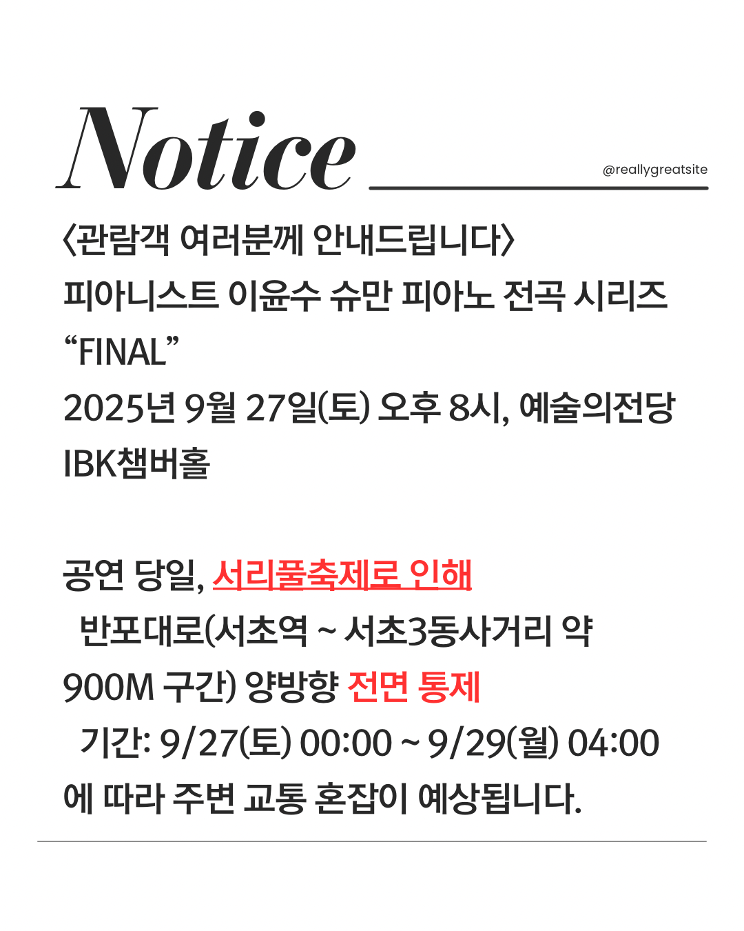 승용차 이용 시 주차장이 혼잡하여 공연장 정시 입장이 어려울 수 있으니, 대중교통을 이용해 주시기 바랍니다.