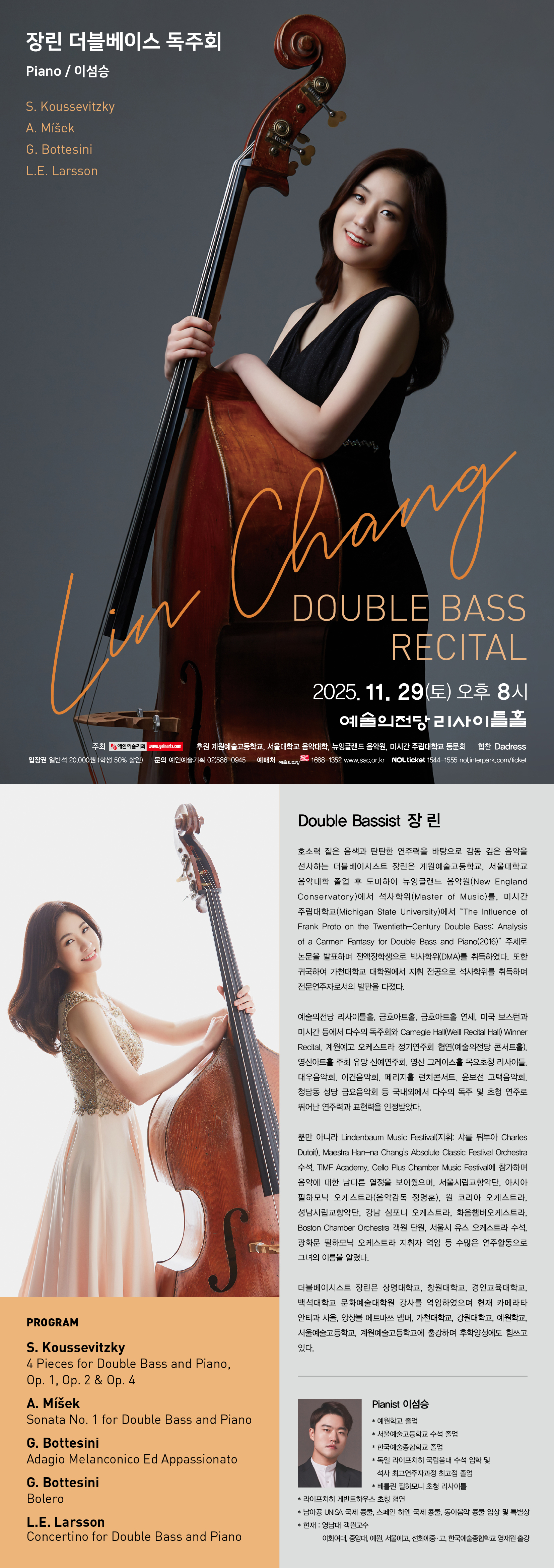 호소력 짙은 음색과 탄탄한 연주력을 바탕으로 감동 깊은 음악을 선사하는 더블베이시스트 장린은 계원예술고등학교, 서울대학교 음악대학 졸업 후 도미하여 뉴잉글랜드 음악원(New England Conservatory)에서 석사학위(Master of Music)를, 미시간 주립대학교(Michigan State University)에서 “The Influence of Frank Proto on the Twentieth-Century Double Bass: Analysis of a Carmen Fantasy for Double Bass and Piano(2016)” 주제로 논문을 발표하며 전액장학생으로 박사학위(DMA)를 취득하였다. 또한 귀국하여 가천대학교 대학원에서 지휘 전공으로 석사학위를 취득하며 전문연주자로서의 발판을 다졌다.