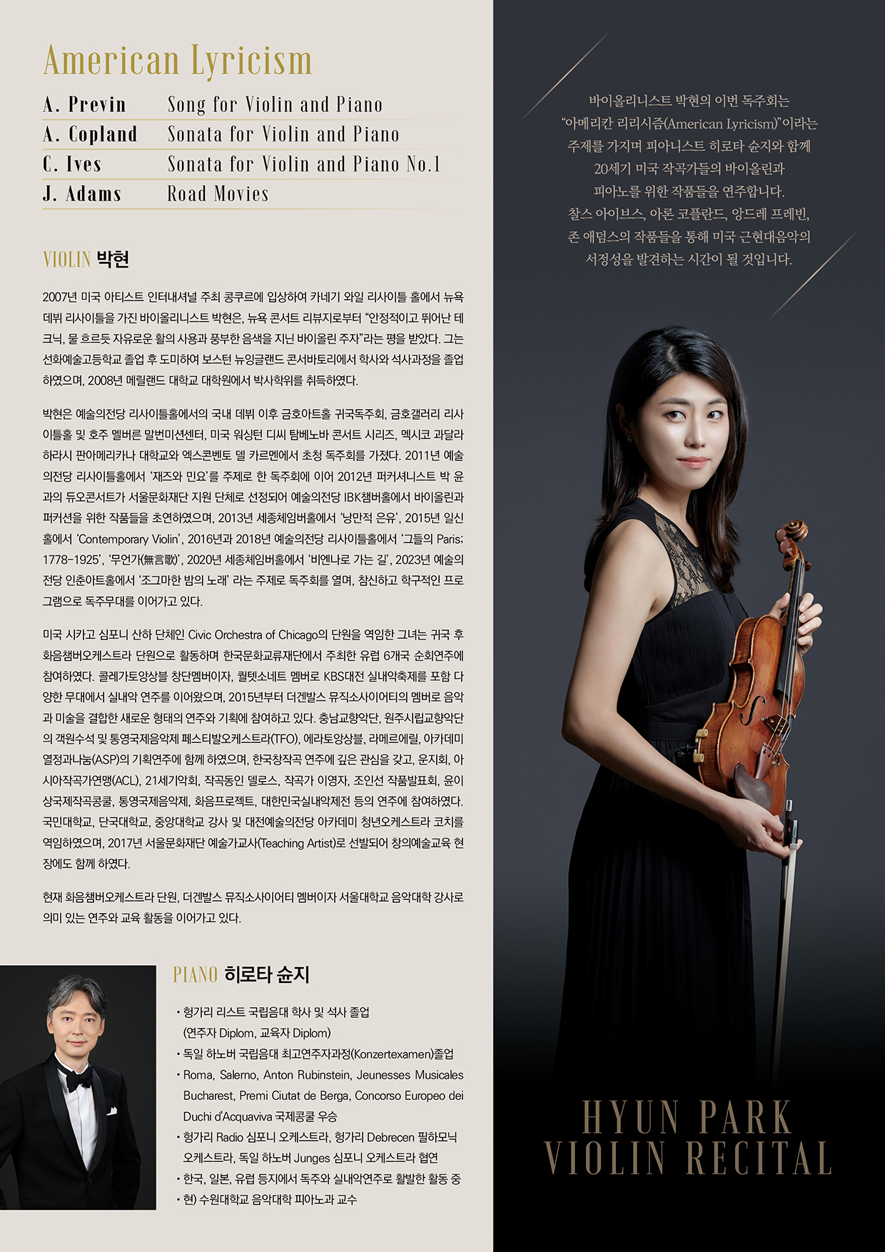 바이올리니스트 박 현의 이번 독주회는 “아메리칸 리리시즘(American Lyricism)”이라는 주제를 가지며 피아니스트 히로타 슌지와 함께 20세기 미국 작곡가들의 바이올린과 피아노를 위한 작품들을 연주합니다. 찰스 아이브스, 아론 코플란드, 앙드레 프레빈, 존 애덤스의 작품들을 통해 미국 근현대음악의 서정성을 발견하는 시간이 될 것입니다.