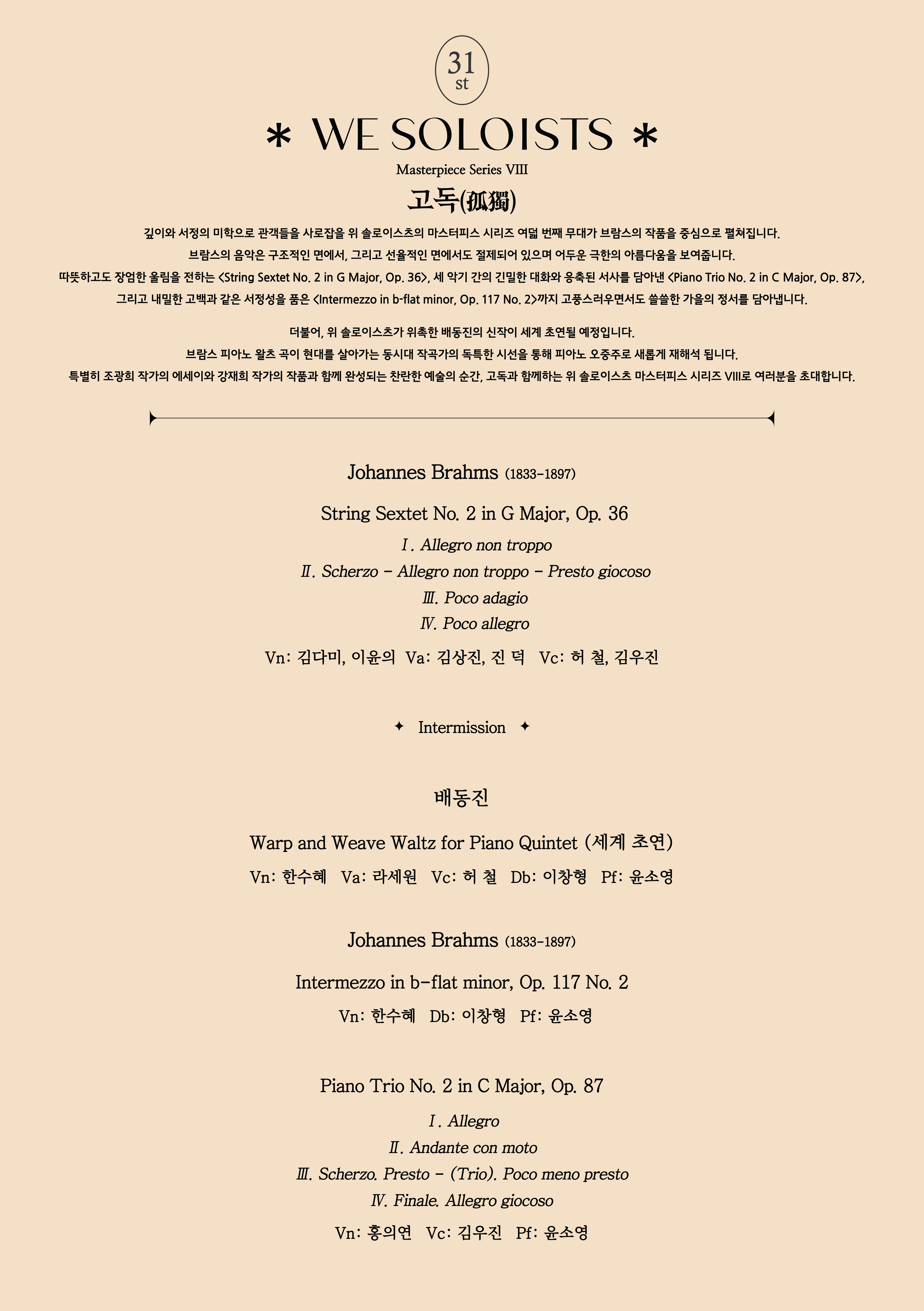 깊이와 서정의 미학으로 관객들을 사로잡을 위 솔로이스츠의 마스터피스 시리즈 여덟 번째 무대가 브람스의 작품을 중심으로 펼쳐집니다. 브람스의 음악은 구조적인 면에서, 그리고 선율적인 면에서도 절제되어 있으며 어두운 극한의 아름다움을 보여줍니다.