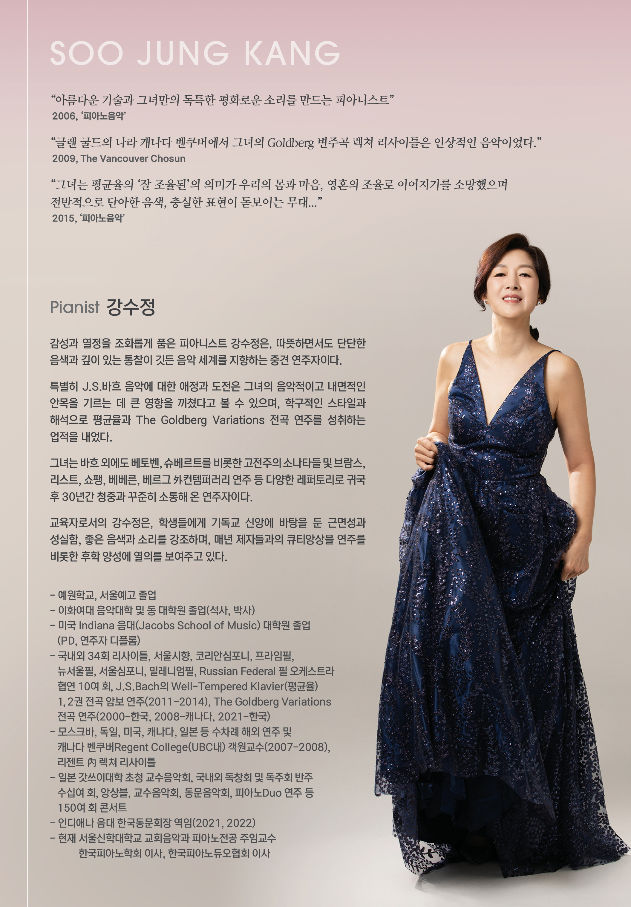 감성과 열정을 조화롭게 품은 피아니스트 강수정은, 따뜻하면서도 단단한 음색과 깊이 있는 통찰이 깃든 음악 세계를 지향하는 중견 연주자이다.