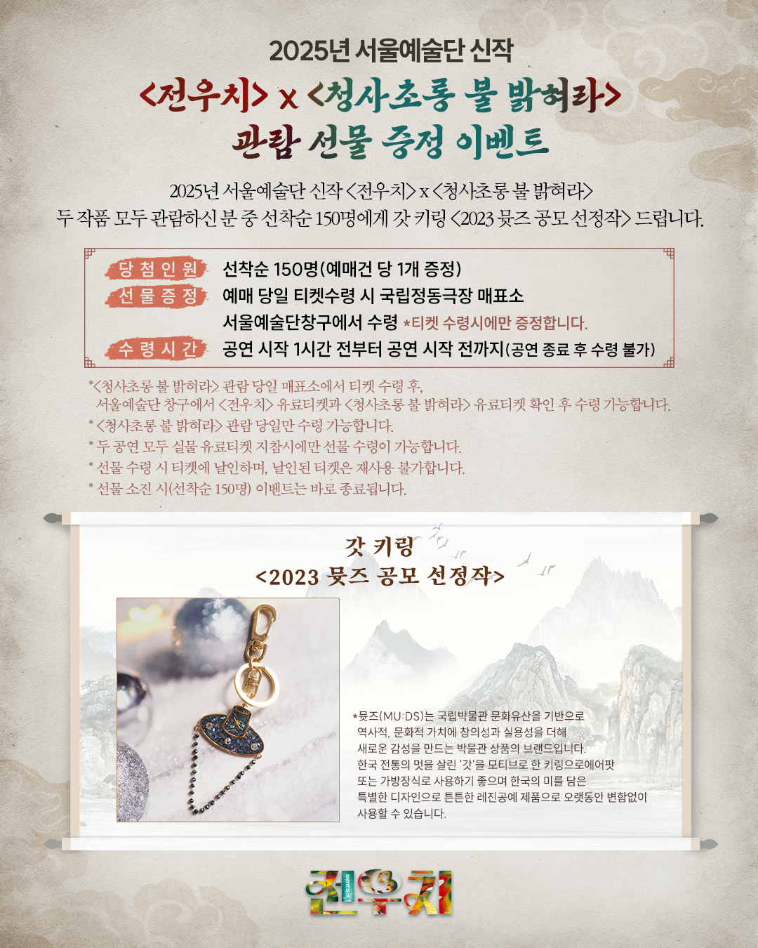 통해 부패한 관료를 처벌하고 백성을 구제했던 영웅으로 평가되는 실존 인물을 모티브로 한 신작 <전우치>는 전통과 현대의 만남에 무대와 음악, 춤을 결합한 예술 총체극으로, 장면마다 환술(幻術)의