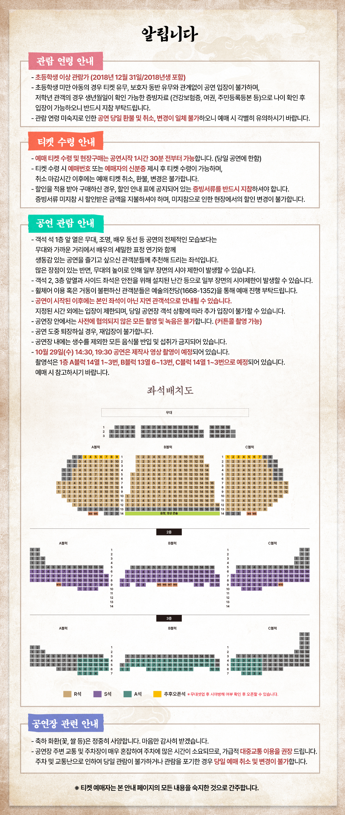 - 공연이 시작된 이후에는 본인 좌석이 아닌 지연 관객석으로 안내될 수 있습니다. 지정된