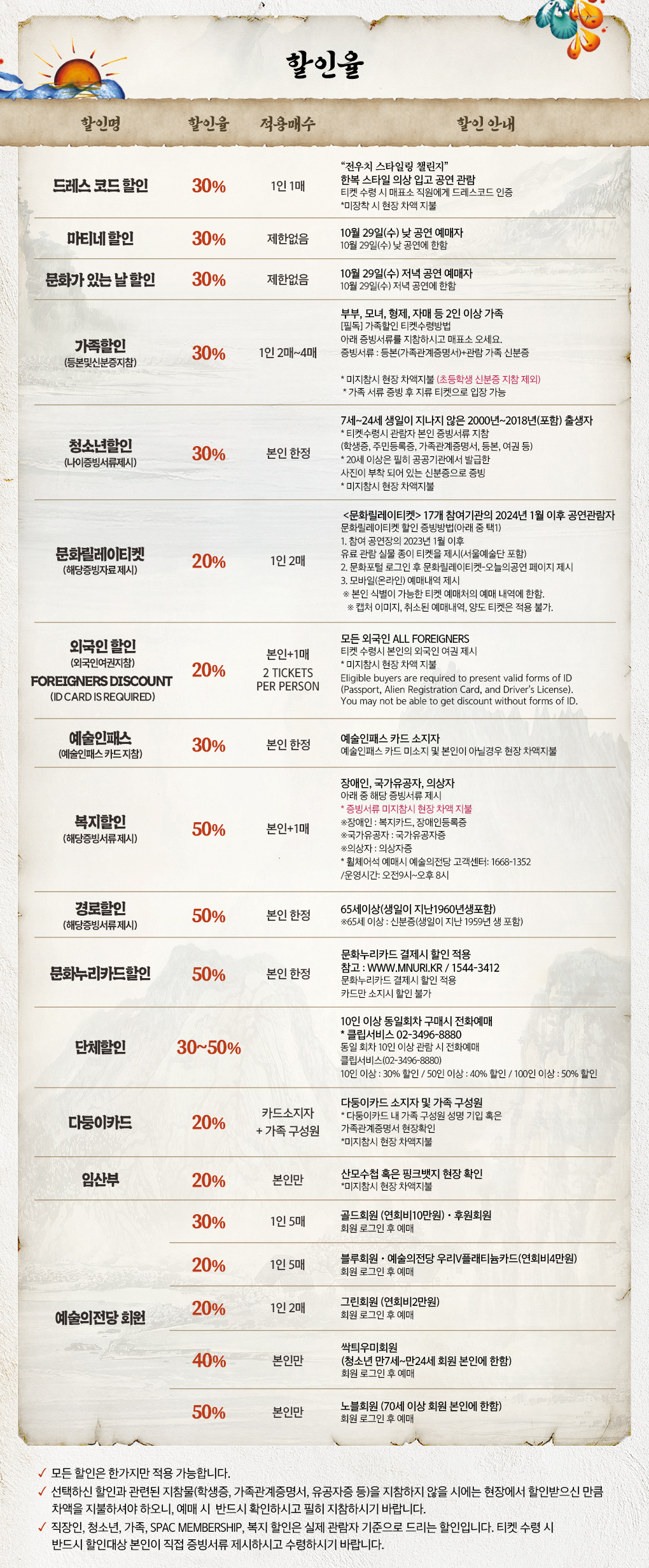 - 외국인 할인(Foreigners Discount) 20% 2매 (티켓 수령 시 외국인등록증 또는 여권 제시 / *미지참시 현장 차액 지불(Eligible buyers are required to present valid forms of ID (Passport, Alien Registration Card, and Driver's License)))