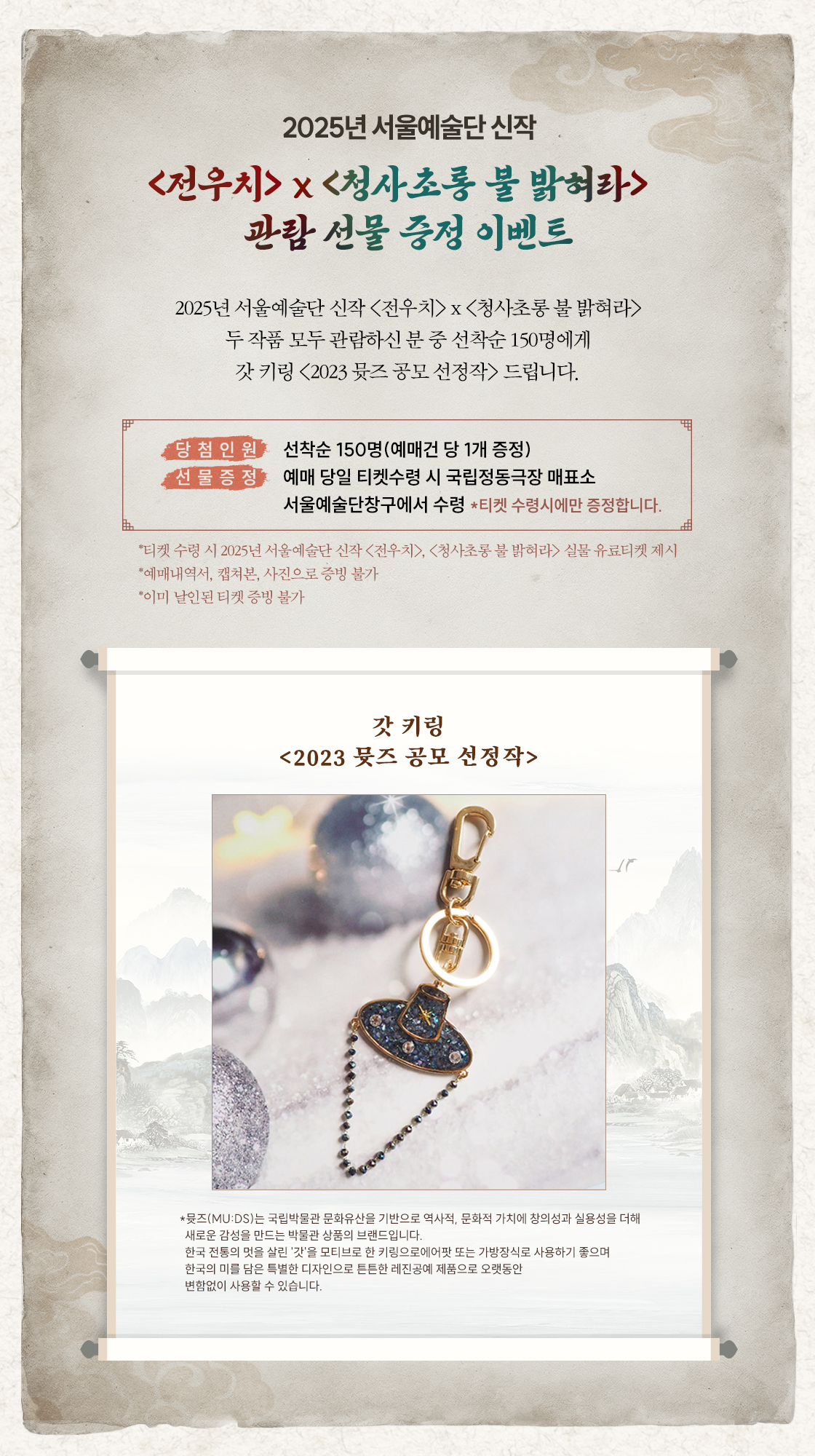 - 드레스 코드 할인 30% 1매 (본인만 / “전우치 스타일링 챌린지” 한복 스타일 의상 입고 공연 관람 티켓 수령 시 매표소 직원에게 드레스코드 인증 *미장착 시 현장 차액 지불)