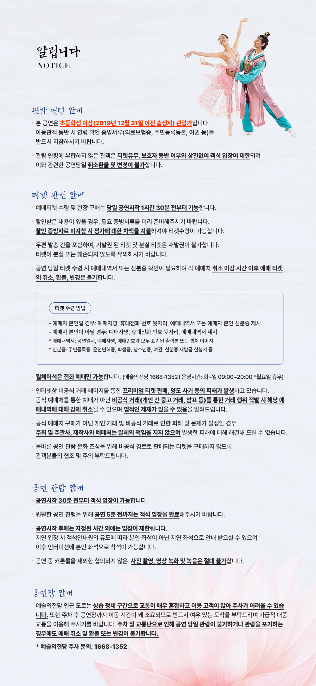 승용차 이용 시 주차장이 혼잡하여 공연장 정시 입장이 어려울 수 있으니, 대중교통을 이용해 주시기 바랍니다.