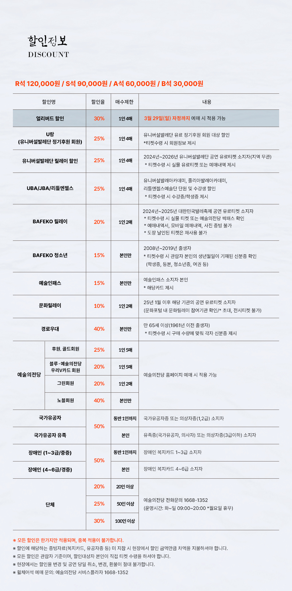- 100인이상단체 30% (매수제한없음 / 100인 이상 구매 시 / 전화예매 및 현장구매 가능)