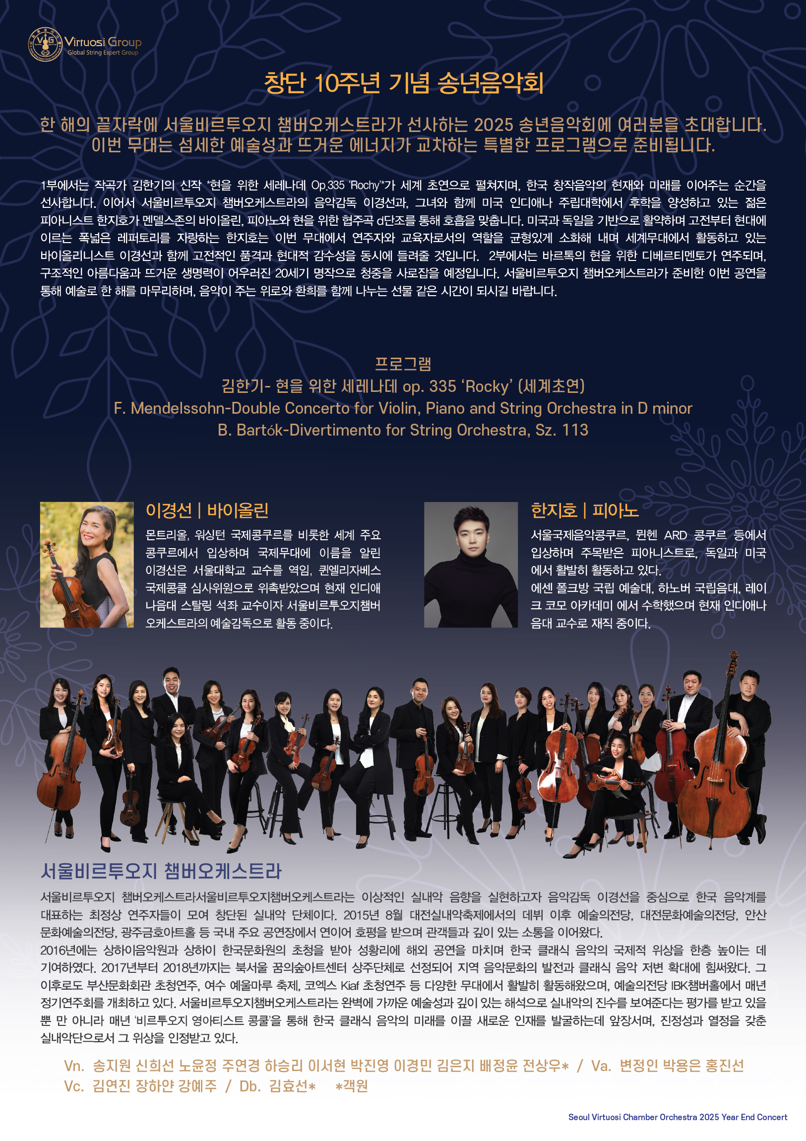한 해의 끝자락에 서울비르투오지 챔버오케스트라가 선사하는 2025 송년음악회에 여러분을 초대합니다. 이번 무대는 섬세한 예술성과 뜨거운 에너지가 교차하는 특별한 프로그램으로 준비됩니다.