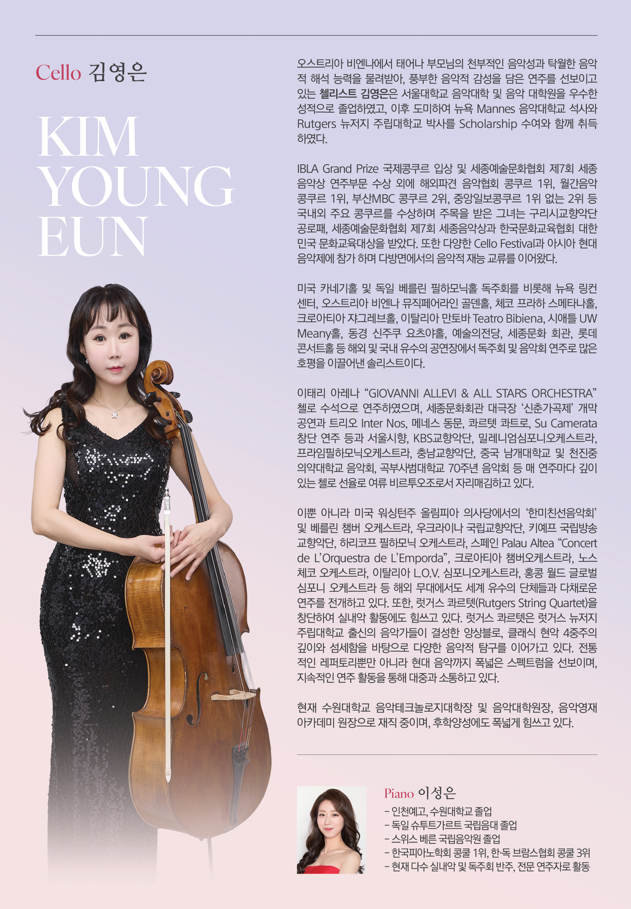 오스트리아 비엔나에서 태어나 부모님의 천부적인 음악성과 탁월한 음악적 해석 능력을 물려받아, 풍부한 음악적 감성을 담은 연주를 선보이고 있는 첼리스트 김영은은 서울대학교 음악대학 및 음악 대학원을 우수한 성적으로 졸업하였고, 이후 도미하여 뉴욕 Mannes 음악대학교 석사와 Rutgers 뉴저지 주립대학교 박사를 Scholarship 수여와 함께 취득하였다.