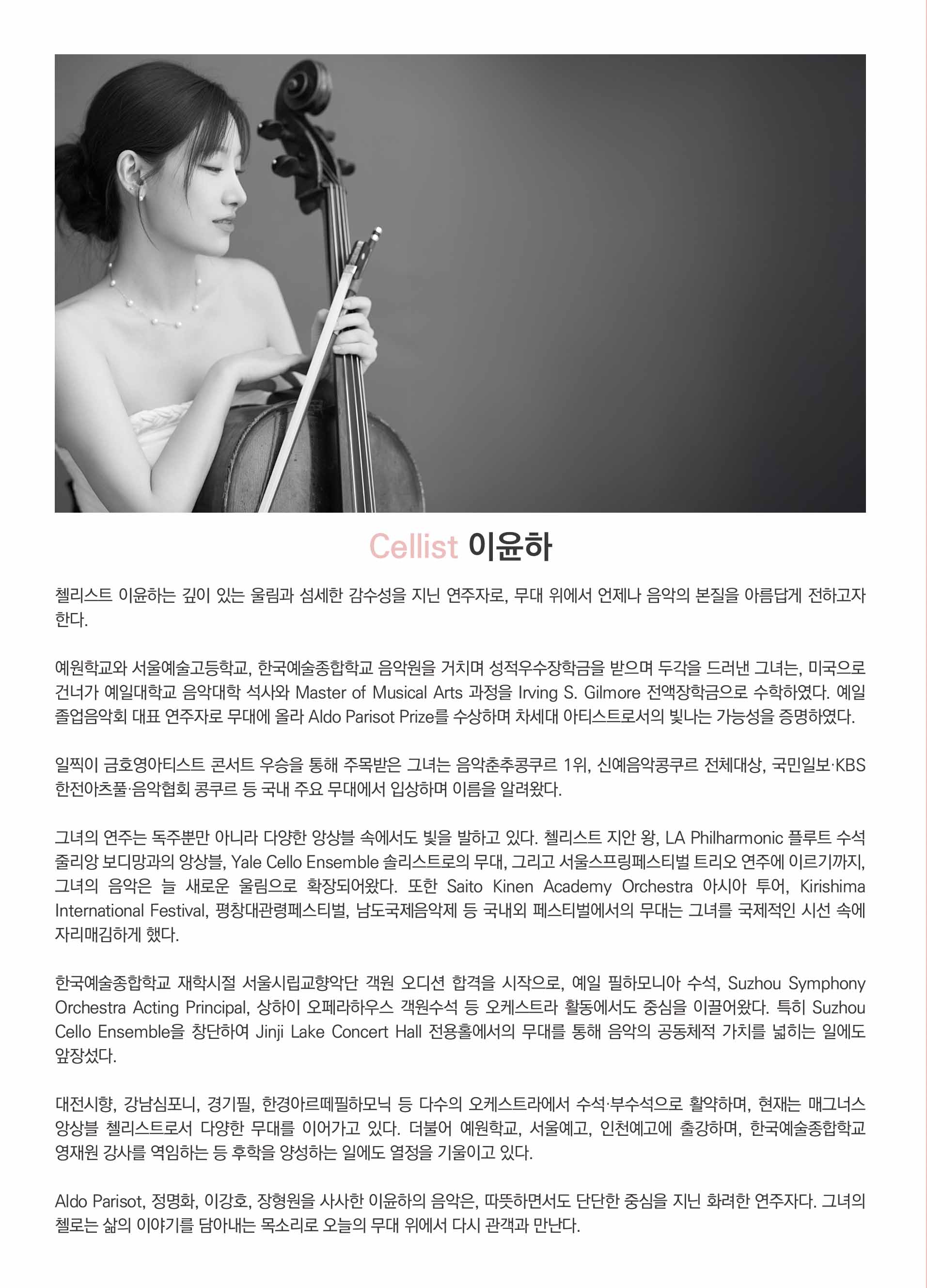 Aldo Parisot, 정명화, 이강호, 장형원을 사사한 이윤하의 음악은, 따뜻하면서도 단단한 중심을 지닌 화려한 연주자다. 그녀의 첼로는 삶의 이야기를 담아내는 목소리로 오늘의 무대 위에서 다시 관객과 만난다.