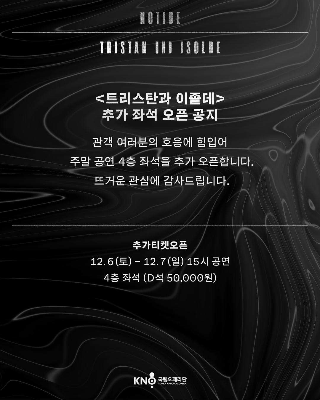 국립오페라단은 2025년 연말을 장식할 작품으로 바그너의 오페라 <트리스탄과 이졸데>를 선보인다. 총 3막으로 구성된 이 작품은 2024년부터 시작된 ‘바그너 시리즈’의 두 번째 무대로, 기사 트리스탄과 공주 이졸데의 치명적인 사랑 이야기를 그린 바그너의 대표 걸작이다. 강렬한 화성과 긴장감 넘치는 선율 속에서 인간의 욕망과 숙명을 응축해낸 이 작품은 ‘죽음조차 뛰어넘는 사랑’을 노래하는 두 주인공의 비극적 서사를 담아낸다. 지휘는 서울시립교향악단의 음악감독 얍 판 츠베덴이 맡아 치밀한 해석과 폭발적인 에너지로 작품의 밀도 높은 음악세계를 펼쳐낸다. 연출은 2023년 독일 콧부스 국립극장에서 <트리스탄과 이졸데>를, 2015·16 시즌 스위스 베른시립극장에서 <로엔그린>을 선보이며 바그너 레퍼토리를 확장해온 슈테판 메르키가 맡아, 시대와 공간을 초월하는 사랑과 죽음의 서사를 깊이 있게 풀어낸다.