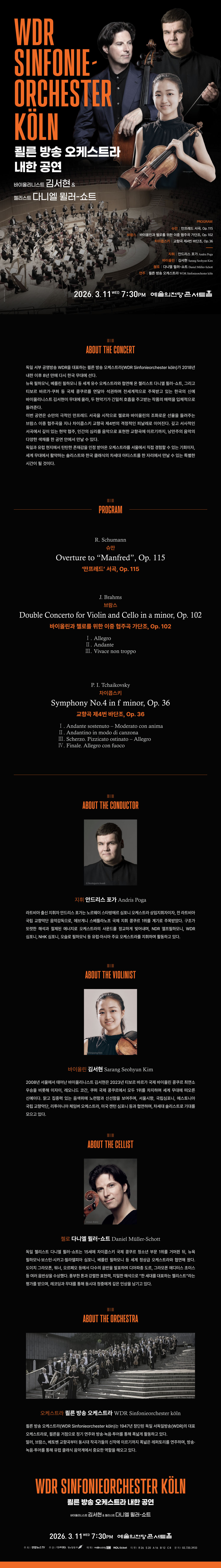 이번 공연은 슈만의 극적인 만프레드 서곡을 시작으로 첼로와 바이올린의 조화로운 선율을 들려주는 브람스 이중 협주곡을 지나 차이콥스키 교향곡 제4번의 격정적인 피날레로 이어진다. 깊고 서사적인 서곡에서 깊이 있는 현악 협주, 인간의 심리를 음악으로 표현한 교향곡에 이르기까지, 낭만주의 음악의 다양한 색채를 한 공연 안에서 만날 수 있다.