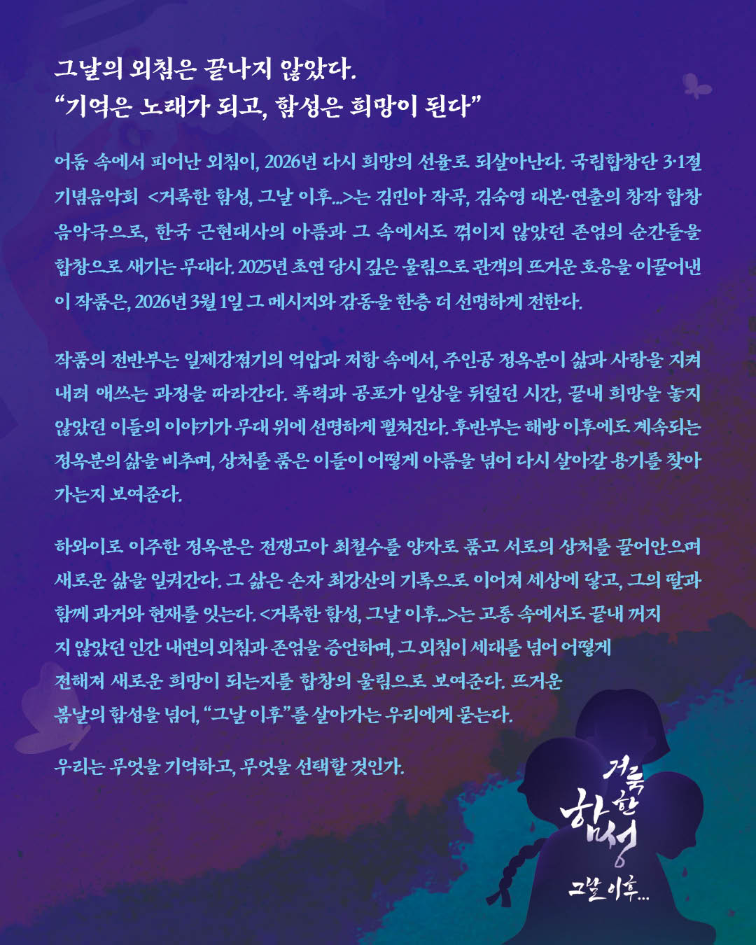 국립합창단 3.1절 기념음악회 <거룩한 함성, 그 날 이후...>에 대한 관람평을 적어주세요.