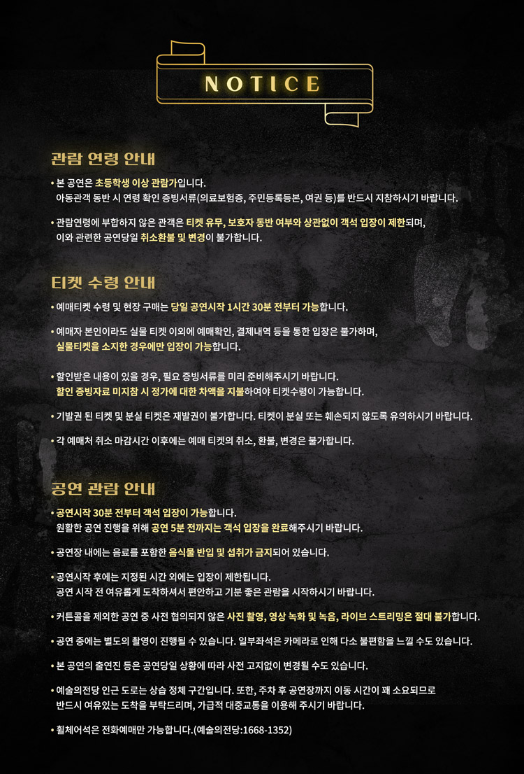 아동 관객 동반 시 연령 확인 증빙서류(의료보험증, 주민등록등본, 여권 등)를 반드시 지참하시기 바랍니다.