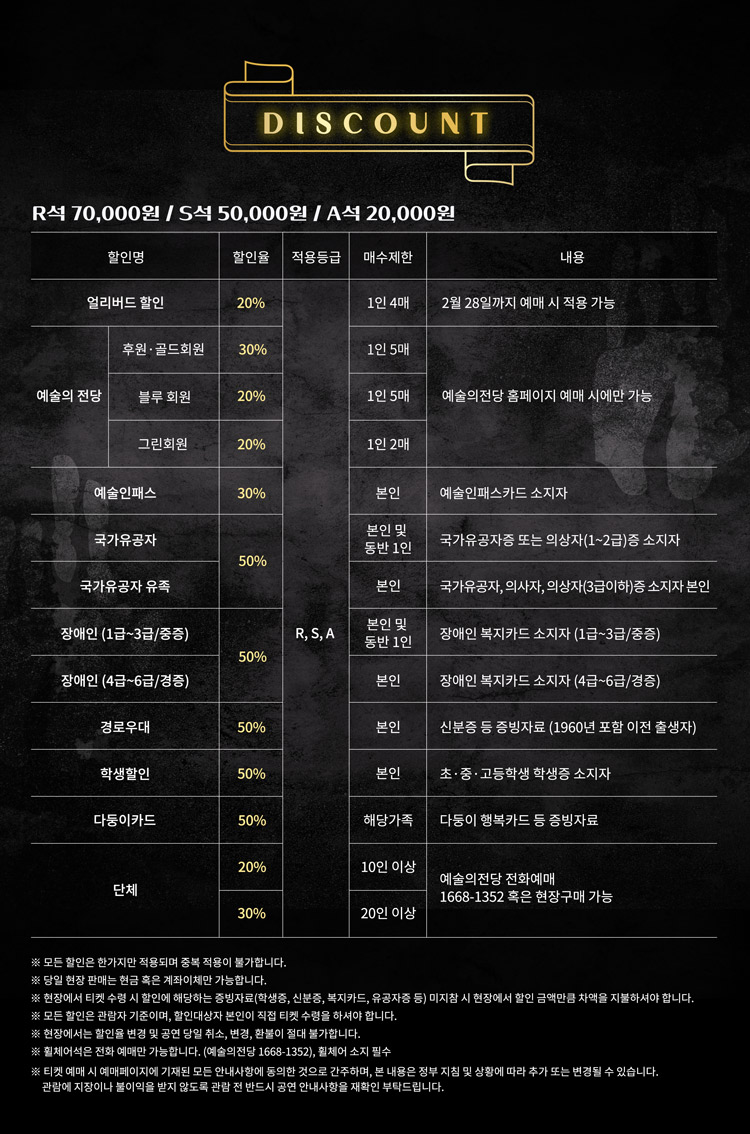 ※ 현장에서 티켓 수령 시 할인에 해당하는 증빙자료(학생증, 신분증, 복지카드, 유공자증 등)를 제시하지 못할경우 차액 지불 후 공연 관람 가능