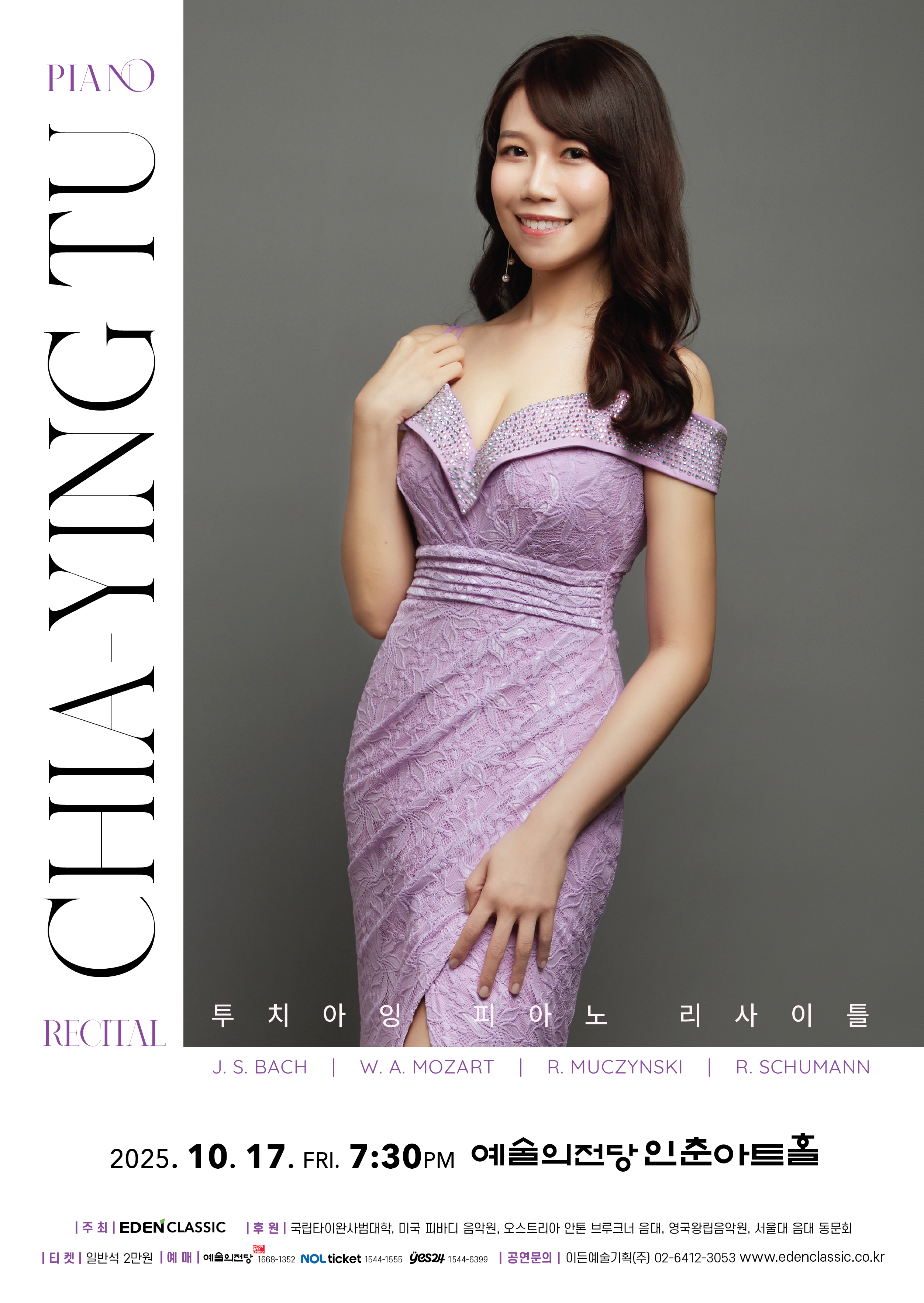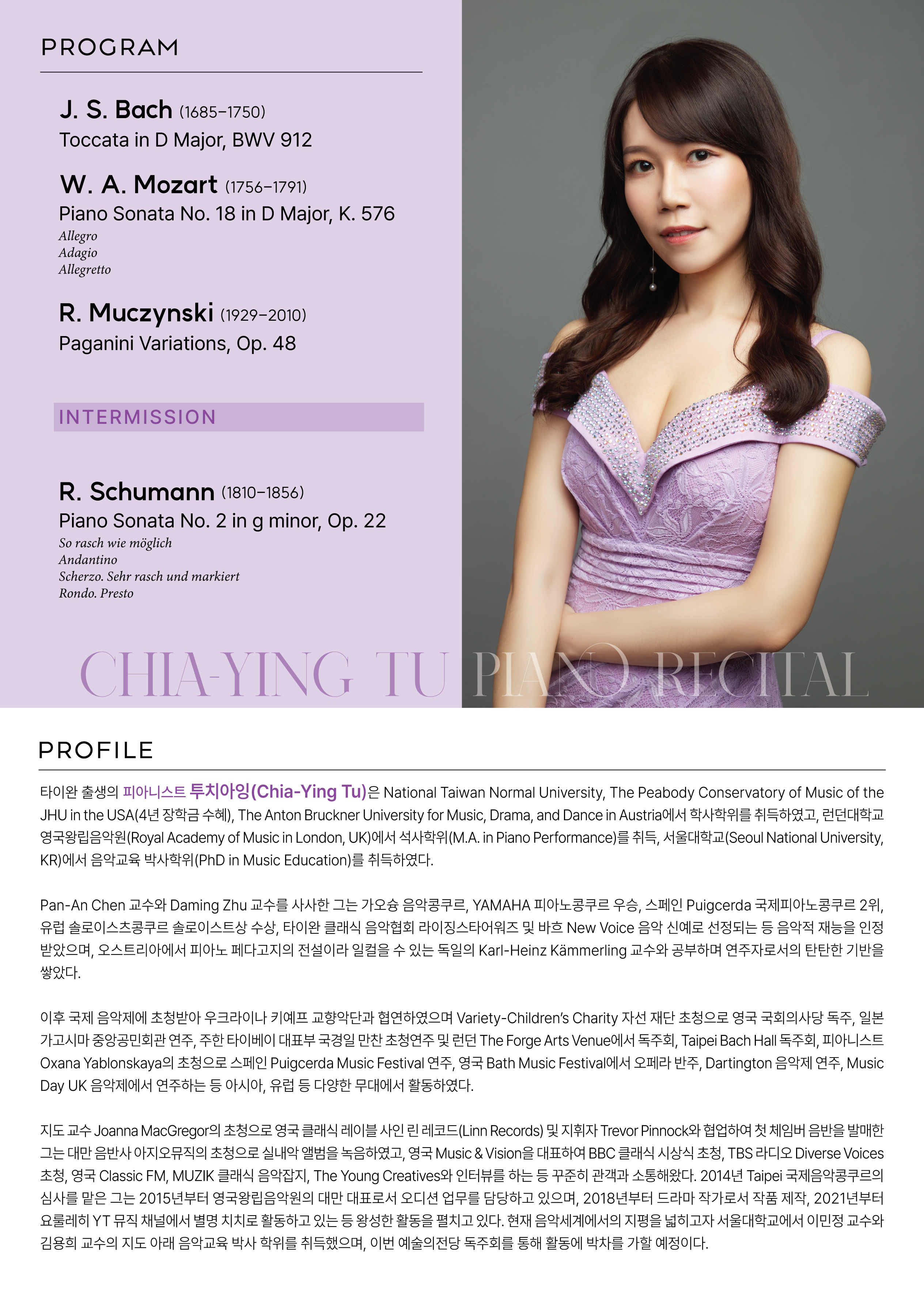 타이완 출생의 피아니스트 투치아잉(Chia-Ying Tu)은 National Taiwan Normal University, The Peabody Conservatory of Music of the JHU in the USA(4년 장학금 수혜), The Anton Bruckner University for Music, Drama, and Dance in Austria에서 학사학위를 취득하였고, 런던대학교 영국왕립음악원(Royal Academy of Music in London, UK)에서 석사학위(M.A. in Piano Performance)를 취득, 서울대학교(Seoul National University, KR)에서 음악교육 박사학위(PhD in Music Education)를 취득하였다.