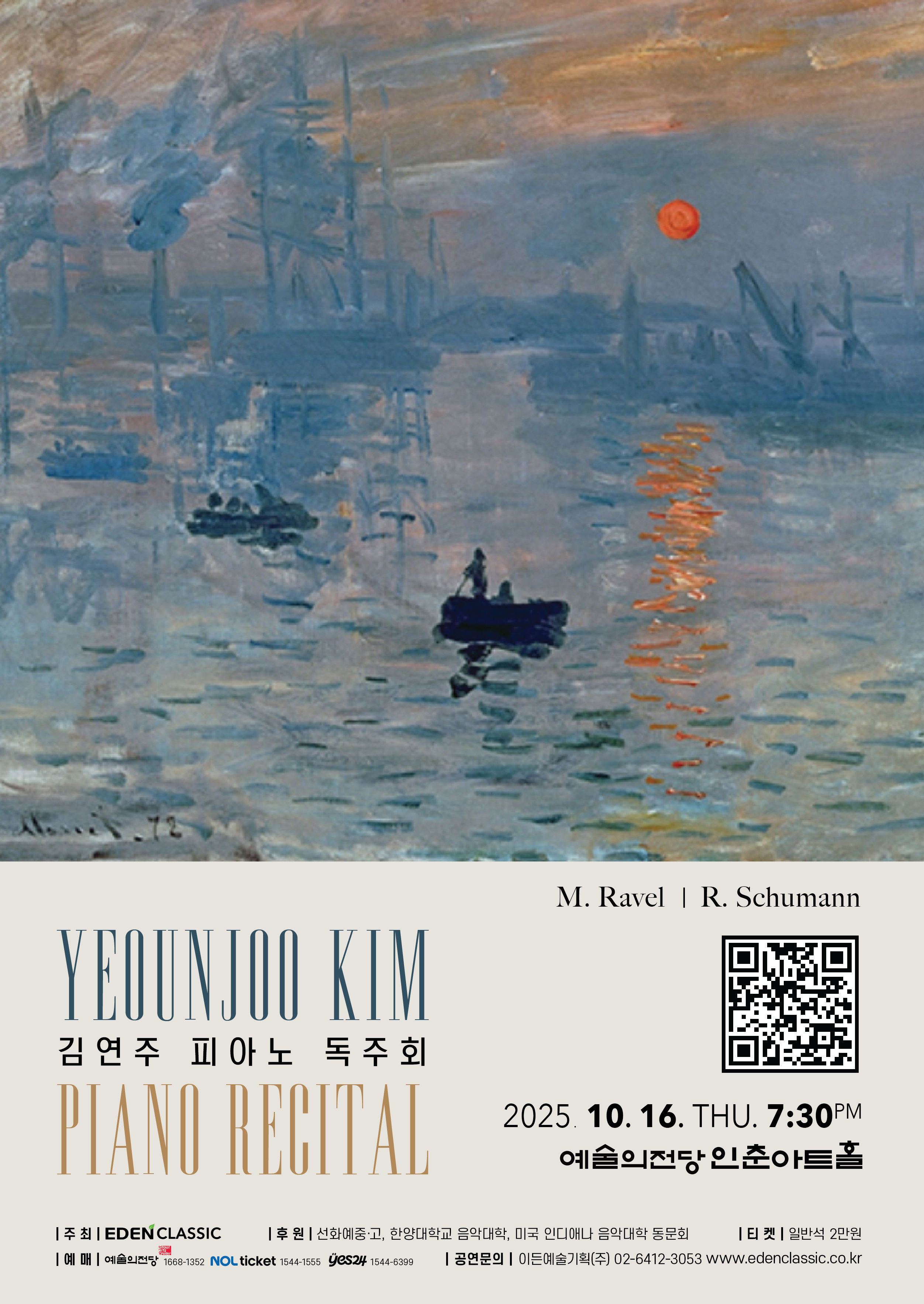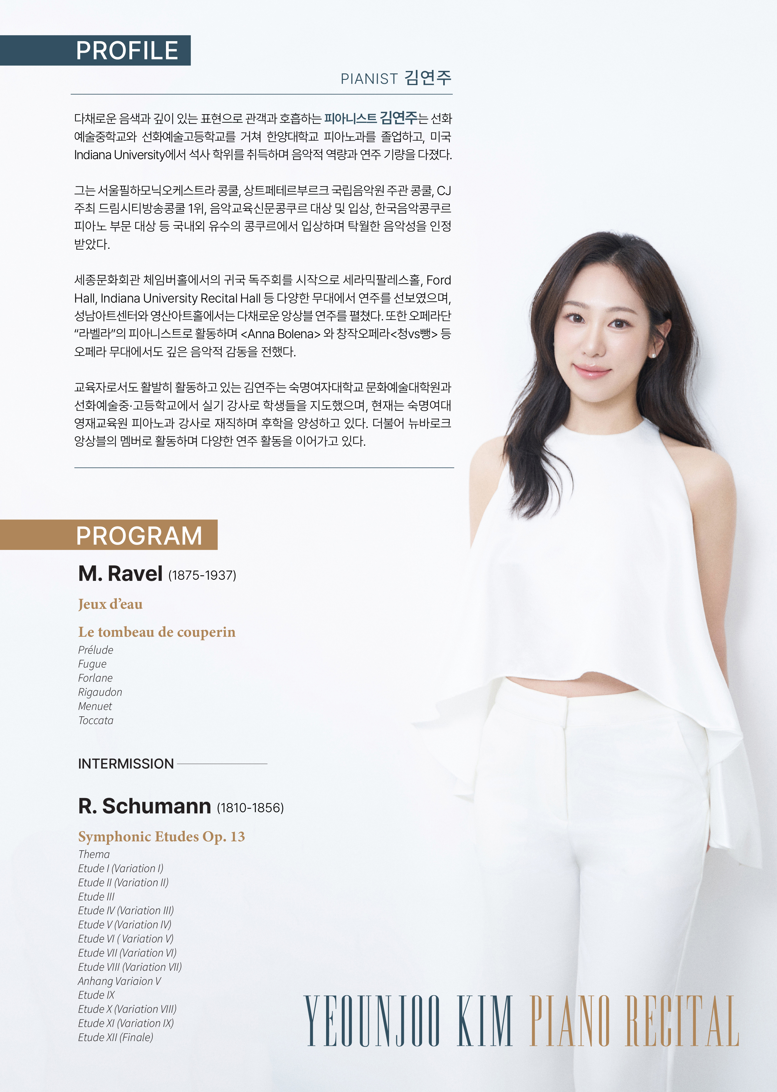 다채로운 음색과 깊이 있는 표현으로 관객과 호흡하는 피아니스트 김연주는 선화예술중학교와 선화예술고등학교를 거쳐 한양대학교 피아노과를 졸업하고, 미국 Indiana University에서 석사 학위를 취득하며 음악적 역량과 연주 기량을 다졌다.