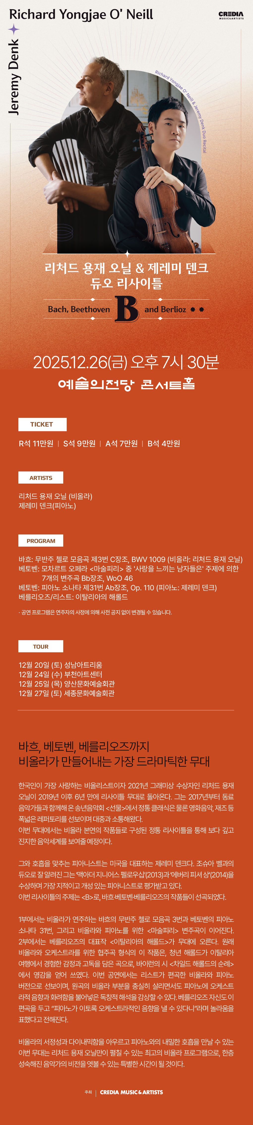 비올라의 서정성과 다이내믹함을 아우르고 피아노와의 내밀한 호흡을 만날 수 있는 이번 무대는 리처드 용재 오닐만이 펼칠 수 있는 최고의 비올라 프로그램으로, 한층 성숙해진 음악가의 비전을 엿볼 수 있는 특별한 시간이 될 것이다.
