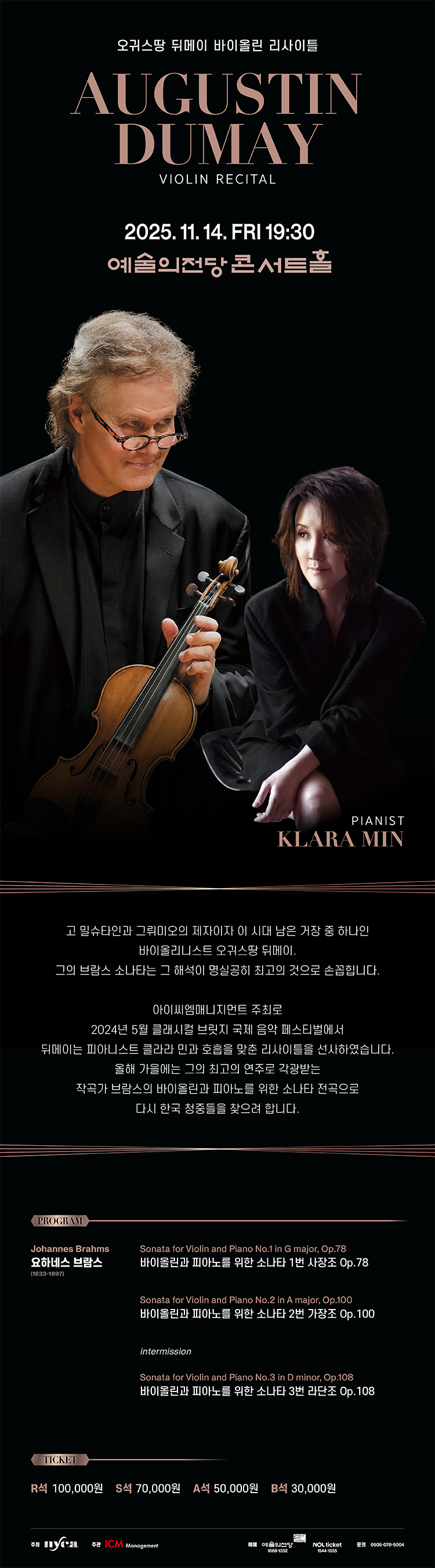 고 밀슈타인과 그뤼미오의 제자이자 이 시대 남은 거장 중 하나인 바이올리니스트 오귀스땅 뒤메이. 그의 브람스 소나타는 그 해석이 명실공히 최고의 것으로 손꼽힙니다. 아이씨엠매니지먼트 주최로 2024년 5월 클래시컬 브릿지 국제 음악 페스티벌에서 뒤메이는 피아니스트 클라라 민과 호흡을 맞춘 리사이틀을 선사하였습니다. 올해 가을에는 그의 최고의 연주로 각광받는 작곡가 브람스의 바이올린과 피아노를 위한 소나타 전곡으로 다시 한국 청중들을 찾으려 합니다.