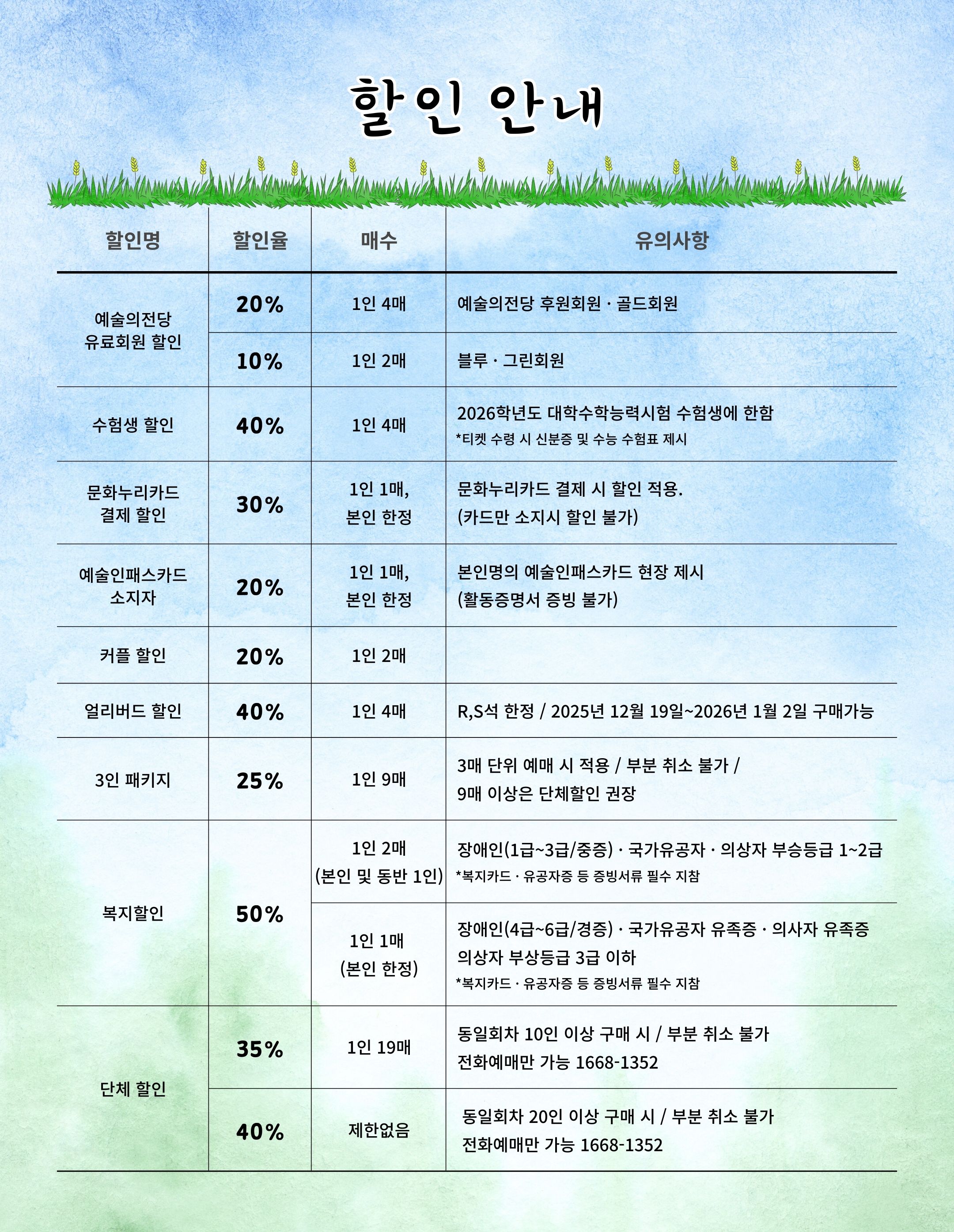 - 수험생 할인 40% 4매 (2026학년도 대학수학능력시험 수험생에 한함 / 티켓 수령 시 수능 수험표 제시)