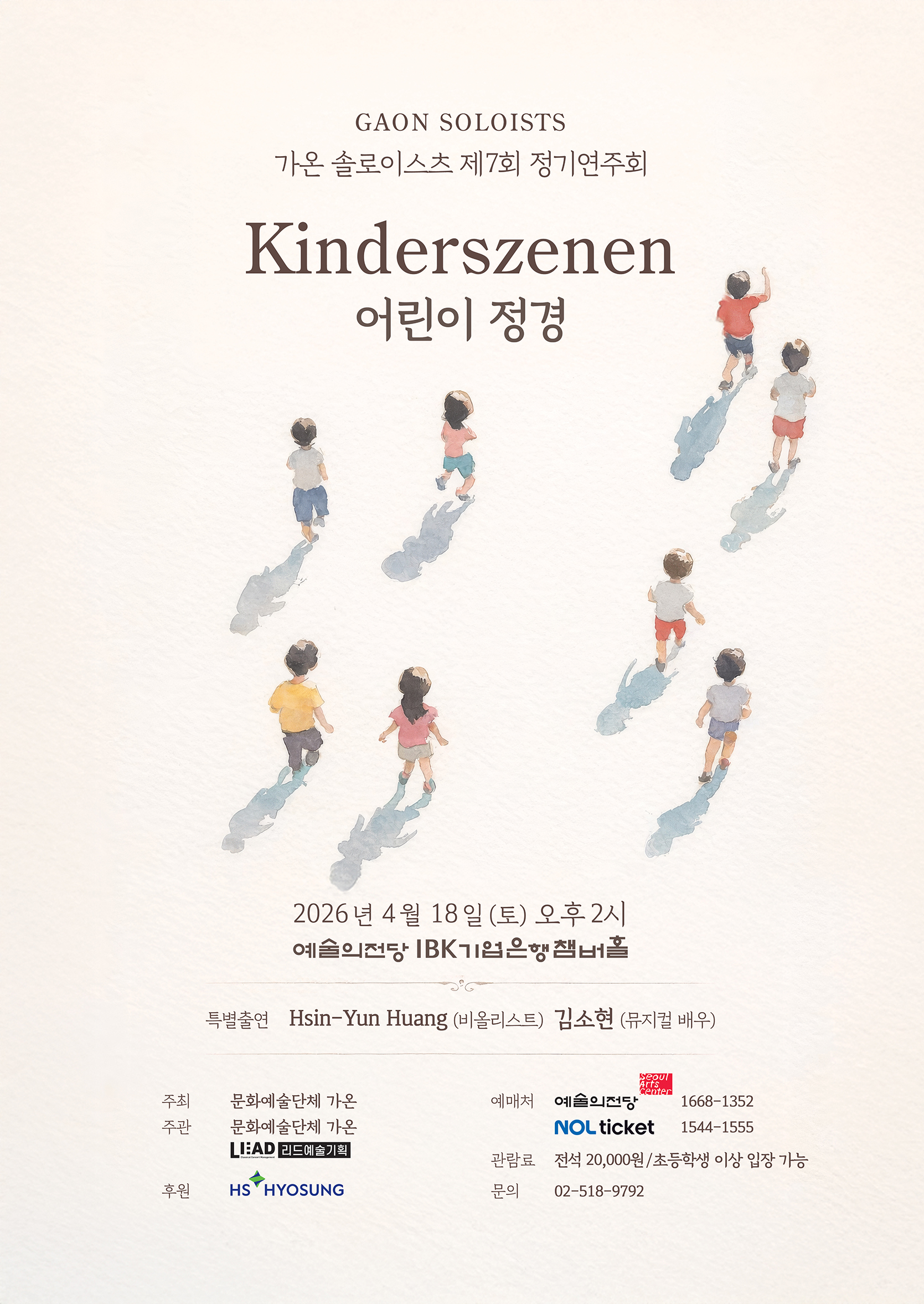 여기서 ‘아이’란 나이가 아니라 세상을 처음 마주하듯 받아들이는 마음의 상태이며, ‘정경’이란 기억 속에 남아 있는 감정의 풍경입니다. 어린이 정경은 특정한 시대의 이야기가 아니라, 누구에게나 마음속에 남아 있는 하나의 풍경입니다. 그리고 가온 솔로이스츠의 일곱번째 정기연주회<어린이 정경>은 바로 그 풍경을 따라가는 음악 여행입니다.
