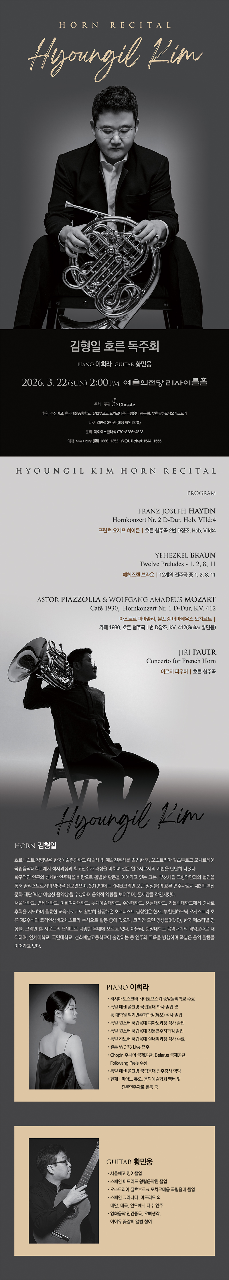 호르니스트 김형일은 한국예술종합학교 예술사 및 예술전문사를 졸업한 후, 오스트리아 잘츠부르크 모차르테움 국립음악대학교에서 석사과정과 최고연주자 과정을 마치며 전문 연주자로서의 기반을 탄탄히 다졌다.