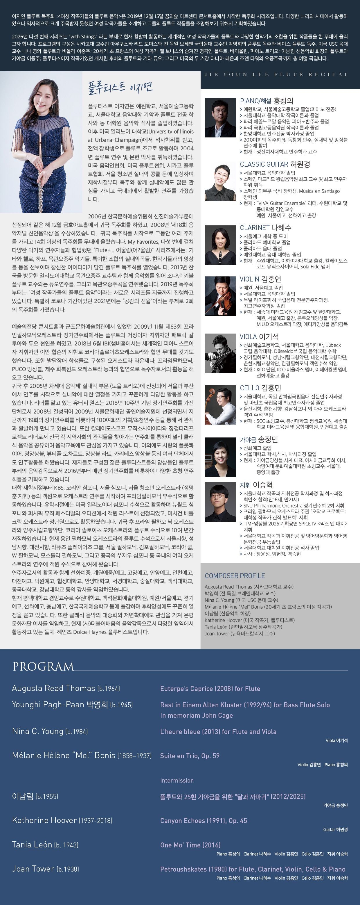 2026년 다섯 번째 시리즈는 "with Strings" 라는 부제로 현재 활발히 활동하는 세계적인 여성 작곡가들의 플루트와 다양한 현악기의 조합을 위한 작품들을 한 무대에 올리고자 합니다. 프로그램의 구성은 시카고대 교수인 아우구스타 리드 토마스와 전 독일 브레멘 국립음대 교수인 박영희의 플루트 독주와 베이스 플루트 독주; 미국 USC 음대 교수 니나 영의 플루트와 비올라 이중주; 20세기 초 프랑스의 여성 작곡가 멜 보니스의 숨겨진 명곡인 플루트, 바이올린, 피아노 트리오; 이남림 신음악회 회장의 플루트와 가야금 이중주; 플루티스이자 작곡가였던 캐서린 후버의 플루트와 기타 듀오; 그리고 미국의 두 거장 타니아 레온과 조앤 타워의 오중주곡까지 총 여덟 곡입니다.