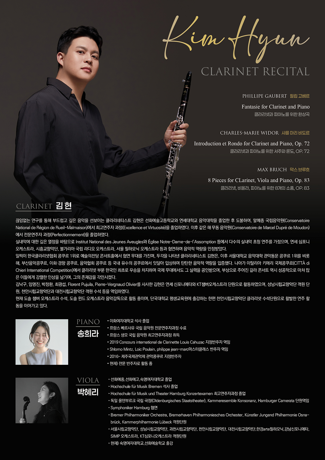 끊임없는 연구를 통해 부드럽고 깊은 음악을 선보이는 클라리네티스트 김현은 선화예술고등학교와 연세대학교 음악대학을 졸업한 후 도불하여, 말메종 국립음악원(Conservatoire National de Région de Rueil-Malmaison)에서 최고연주자 과정(Excellence et Virtuosité)을 졸업하였다. 이후 같은 해 무동 음악원(Conservatoire de Marcel Dupré de Moudon)에서 전문연주자 과정(Perfectionnement)을 졸업하였다.