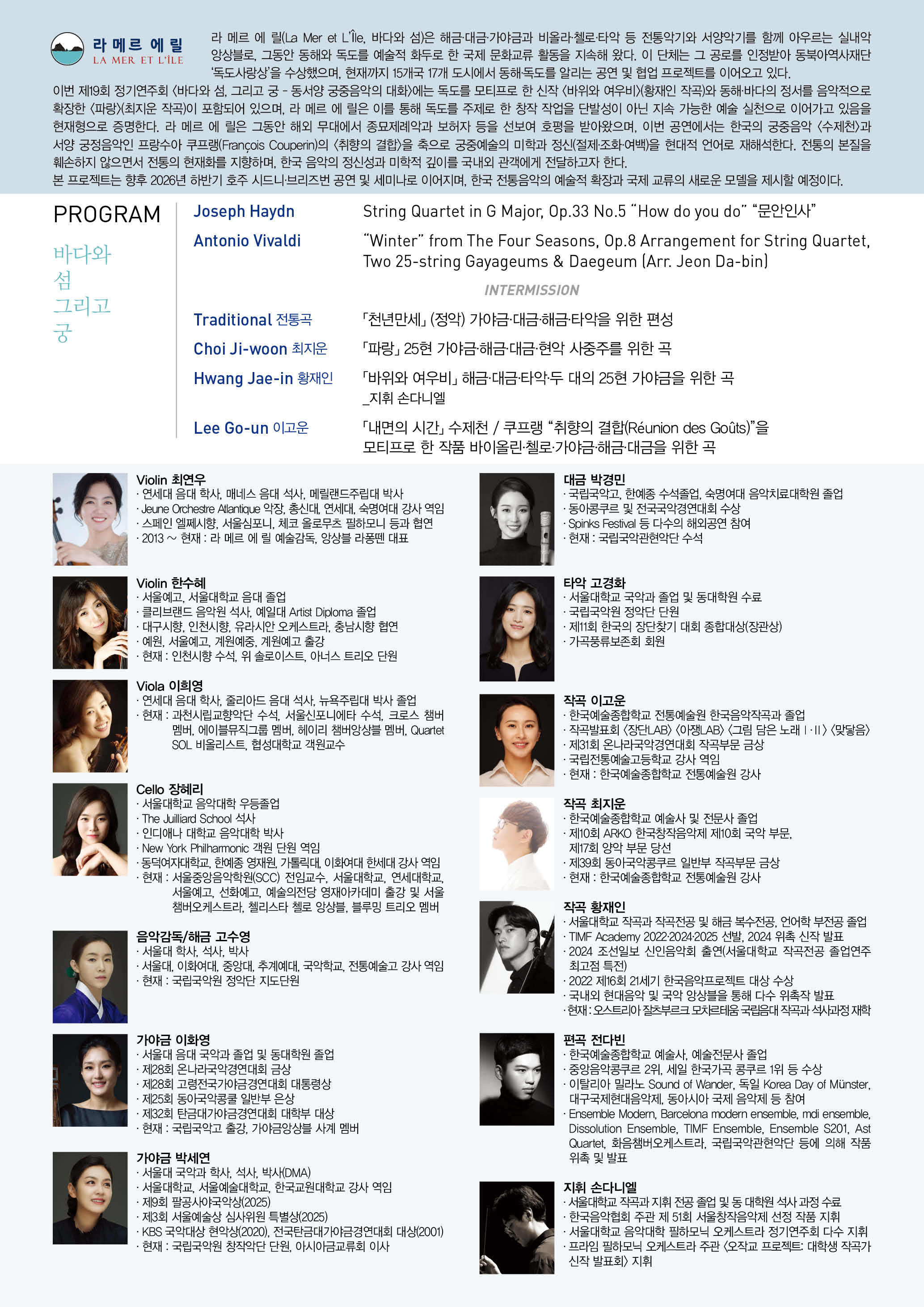 라 메르 에 릴은 그동안 해외 무대에서 종묘제례악과 보허자 등을 선보여 호평을 받아왔으며, 이번 공연에서는 한국의 궁중음악 〈수제천〉과 서양 궁정음악인 프랑수아 쿠프랭(François Couperin)의 <취향의 결합>을 축으로 궁중예술의 미학과 정신(절제·조화·여백)을 현대적 언어로 재해석한다. 전통의 본질을 훼손하지 않으면서 전통의 현재화를 지향하며, 한국 음악의 정신성과 미학적 깊이를 국내외 관객에게 전달하고자 한다.