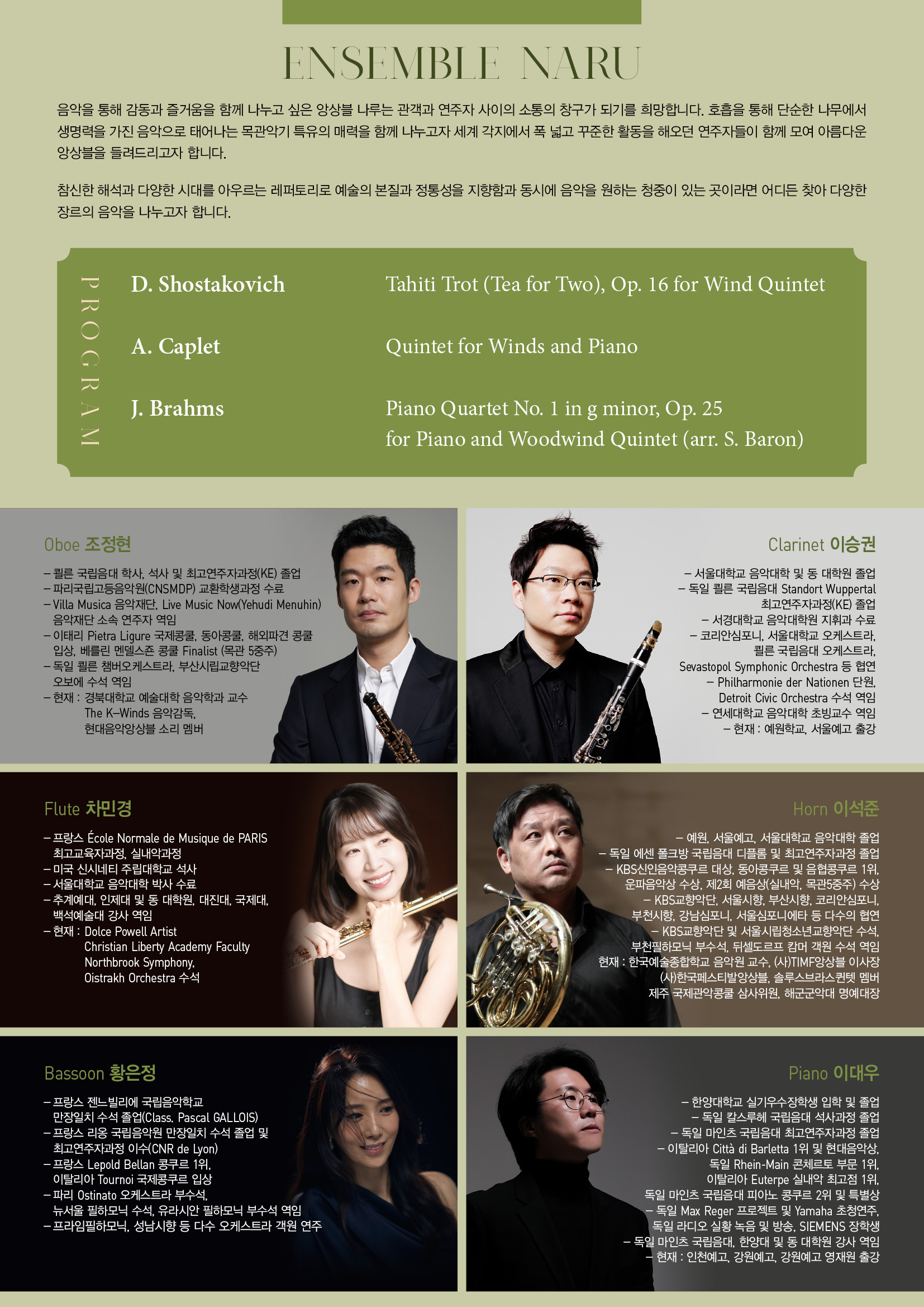음악을 통해 감동과 즐거움을 함께 나누고 싶은 앙상블 나루는 관객과 연주자 사이의 소통의 창구가 되기를 희망합니다. 호흡을 통해 단순한 나무에서 생명력을 가진 음악으로 태어나는 목관악기 특유의 매력을 함께 나누고자 세계 각지에서 폭 넓고 꾸준한 활동을 해오던 연주자들이 함께 모여 아름다운 앙상블을 들려드리고자 합니다.
