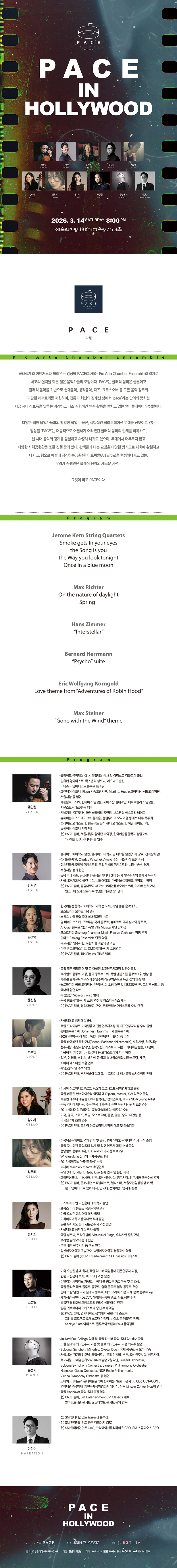 클래식계의 어벤져스라 불리우는 앙상블 PACE(파체)는 Pro Arte Chamber Ensemble의 약자로 최고의 실력을 갖춘 젊은 음악가들의 모임이다. PACE는 클래식 음악은 물론이고 클래식 음악을 기반으로 현대음악, 창작음악, 재즈, 크로스오버 등 모든 음악 장르의 과감한 레퍼토리를 지향하며, 전통과 혁신의 경계선 상에서 'pace'라는 단어의 뜻처럼 지금 시대의 보폭을 맞추는 과감하고 다소 실험적인 연주 활동을 펼치고 있는 멀티플레이어 앙상블이다.