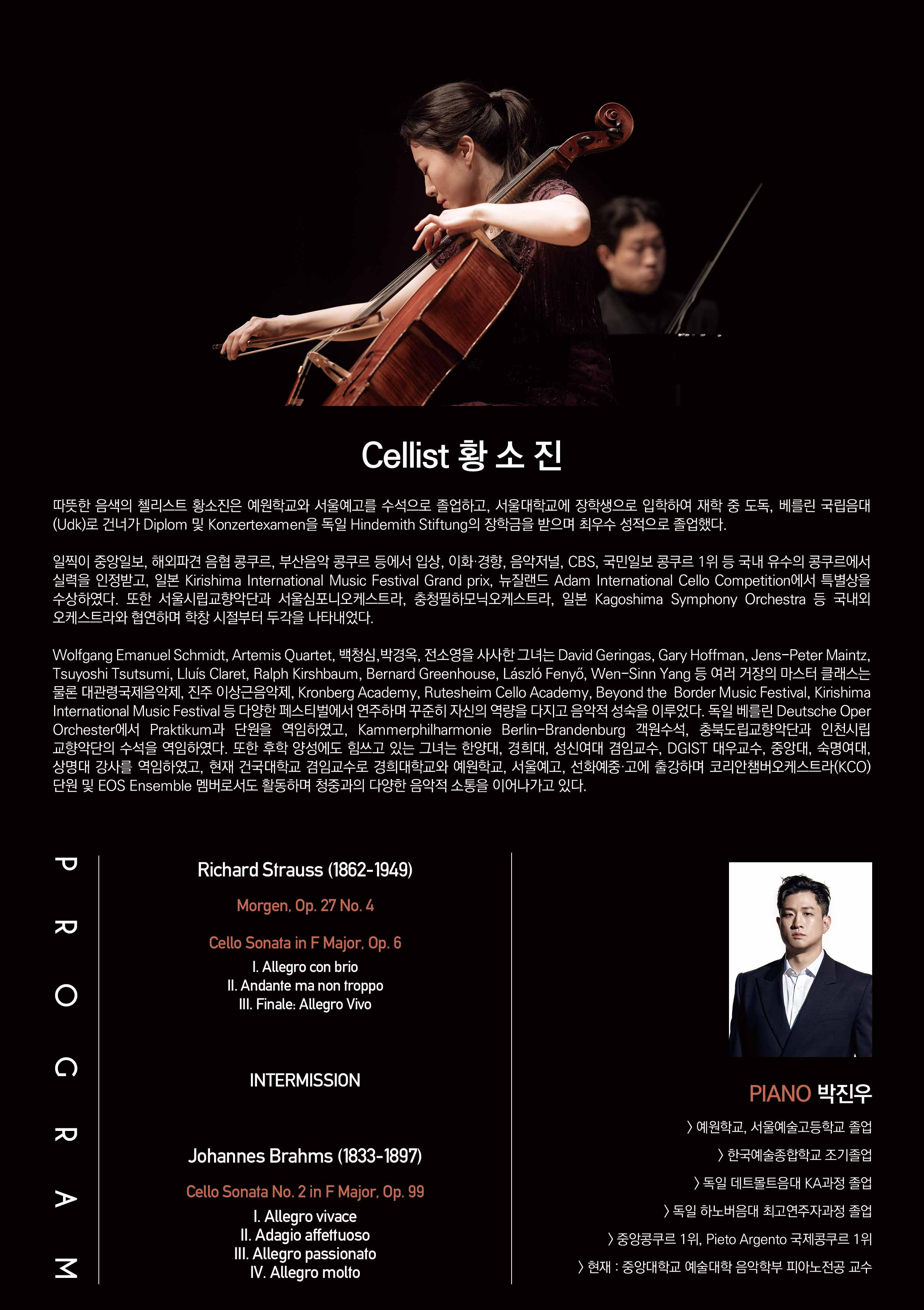 따뜻한 음색의 첼리스트 황소진은 예원학교와 서울예고를 수석으로 졸업하고, 서울대학교에 장학생으로 입학하여 재학 중 도독, 베를린 국립음대(Udk)로 건너가 Diplom 및 Konzertexamen을 독일 Hindemith Stiftung의 장학금을 받으며 최우수 성적으로 졸업했다.