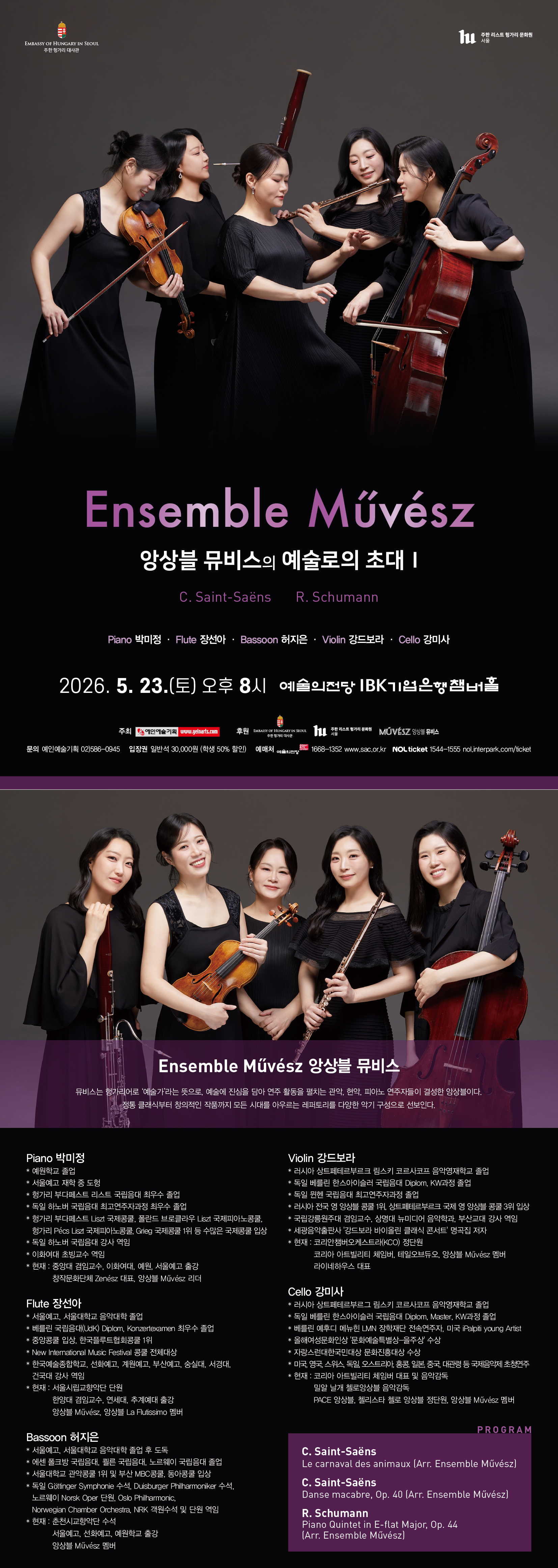 뮤비스는 헝가리어로 ‘예술가’라는 뜻으로, 예술에 진심을 담아 연주 활동을 펼치는 관악, 현악, 피아노 연주자들이 결성한 앙상블이다. 정통 클래식부터 창의적인 작품까지 모든 시대를 아우르는 레퍼토리를 다양한 악기 구성으로 선보인다.