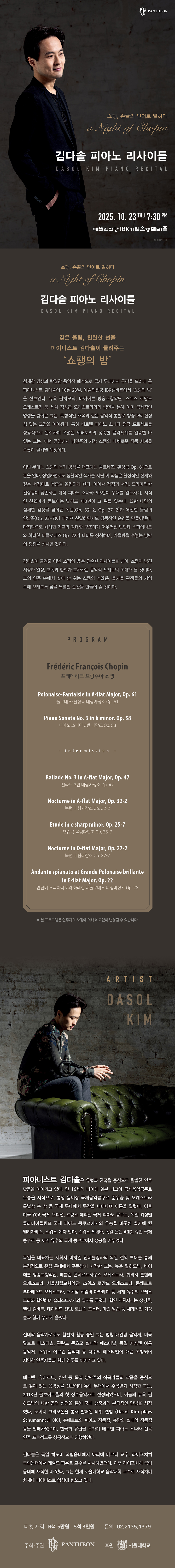 순간을 만들어낸다. 마지막으로 화려한 기교와 장대한 구조미가 어우러진 안단테 스피아나토와 화려한 대폴로네즈 Op. 22가 대미를 장식하며, 가을밤을 수놓는 낭만의 정점을 선사할