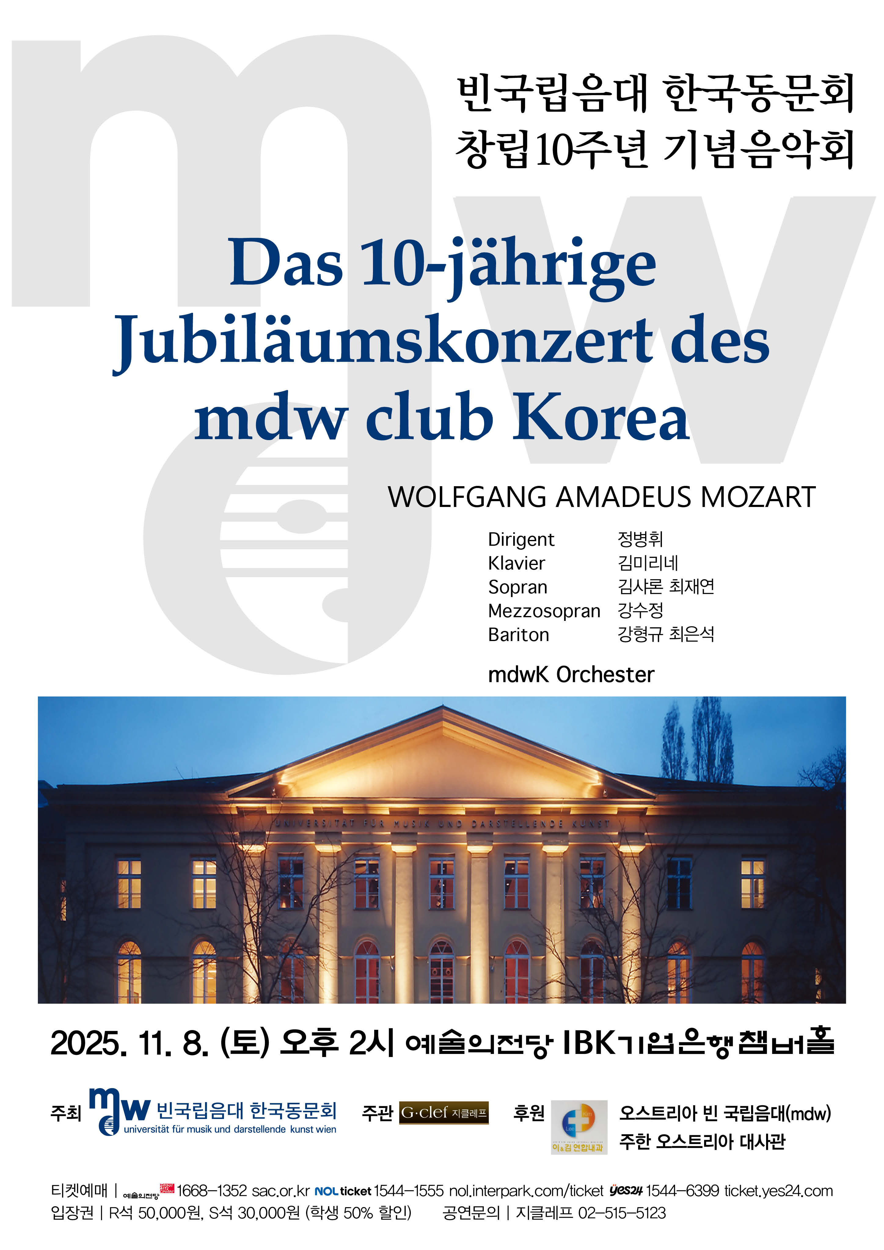1817년, 빈 음악협회(Gesellschaft der Musikfreunde)의 지원으로 설립된 빈 국립음악예술대학교(Universität für Musik und darstellende Kunst Wien - mdw)는 오스트리아 빈에 위치한 세계적인 예술대학으로, 200년이 넘는 전통과 명성을 자랑합니다.