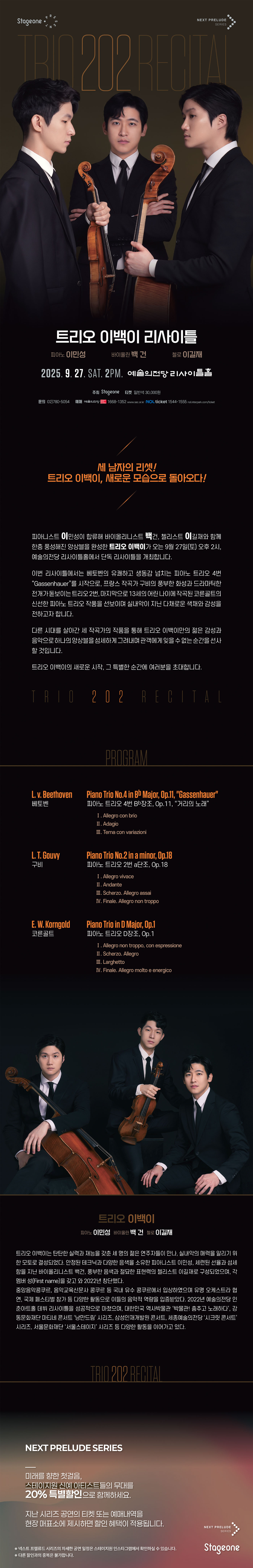 - 넥스트 프렐류드 시리즈 관람자 할인 20% 1매 (매표소에서 지난 시리즈 실물 티켓 또는 예매내역 제시)