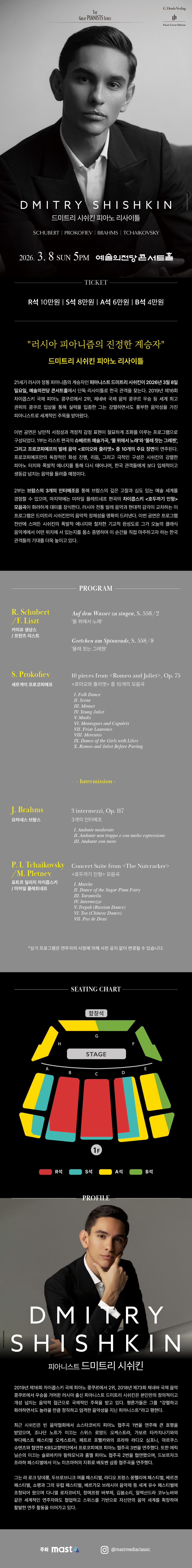 제16회 차이콥스키 국제 피아노 콩쿠르에서 은메달을, 제73회 제네바 국제 음악 콩쿠르에서 우승을 거머쥔 드미트리 시쉬킨은 그만의 창의적이고 개성적인 음악적 접근으로 국제적인 주목을 받고 있다. 평론가들은 그를 “강렬하고 화려하면서도 놀라울 만큼 정직하고 엄격한 음악성을 지닌 피아니스트”라고 평한다.