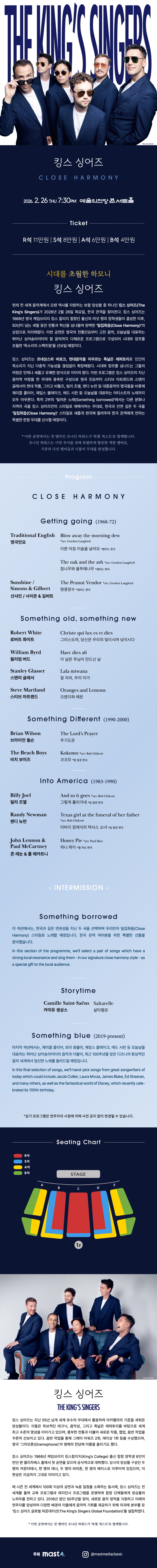 킹스 싱어즈(The King's Singers)는 창단 이래 50년이 훌쩍 지난 지금까지 전세계적으로 활동을 이어오는 아카펠라 형식의 대표적인 그룹이다. 이들은 청중과의 호흡과 소통을 가장 중요시하며, 뛰어난 테크닉, 다재다능한 퍼포먼스, 그리고 기술적 화려함으로도 널리 인정받고 있다. 킹스 싱어즈는 자신들의 역사와 개척 정신을 바탕으로 전 세계의 최고 무대에서 활약하며, 독창적인 작품과 유니크한 협업을 통해 더욱 다양한 레퍼토리를 만들어 내고 있다.